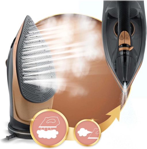 Soepel glijden, gelijkmatige stoomverdeling en gemakkelijk strijken, zelfs op moeilijk bereikbare plekken dankzij de precieze punt.