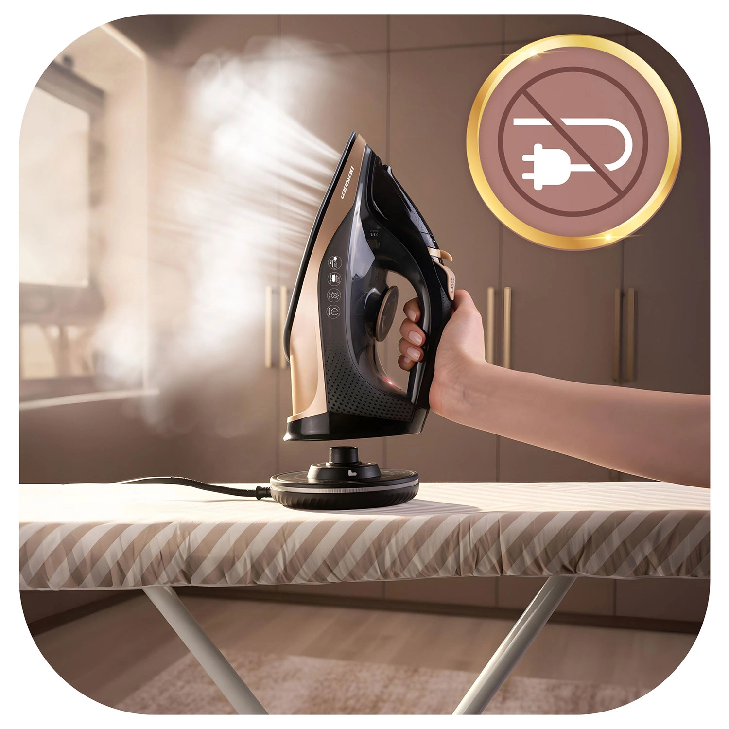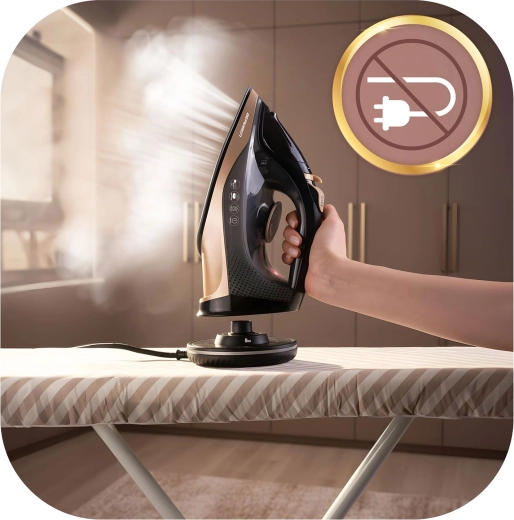 Gebruik het strijkijzer vrij zonder snoer of vergrendel de basis en strijk zoals met een klassiek model – altijd een stabiele temperatuur en soepel werken.