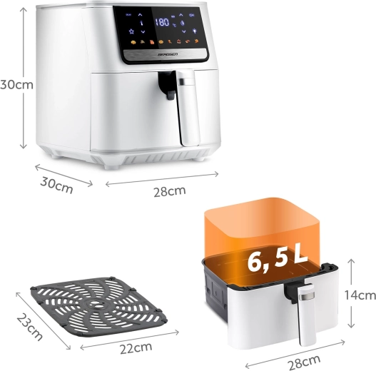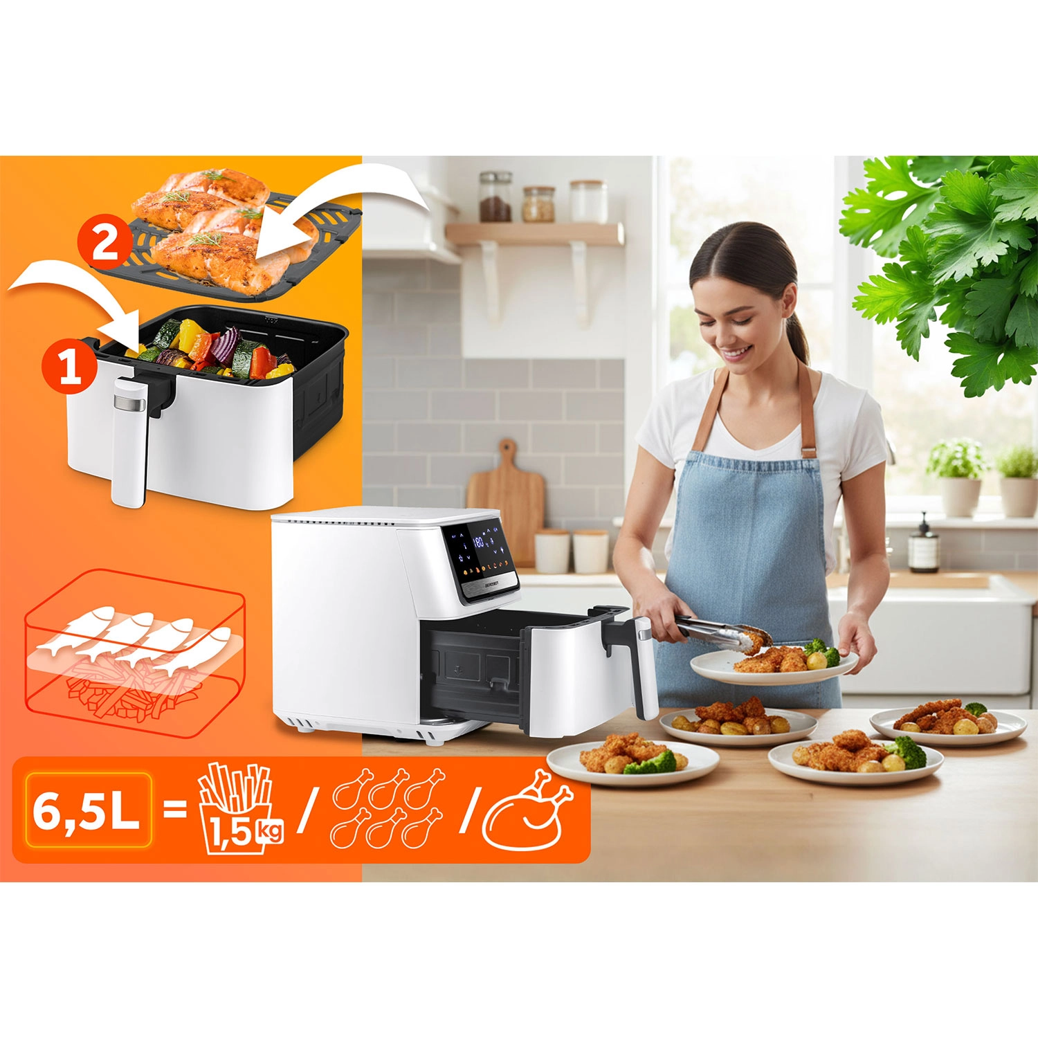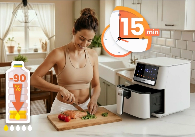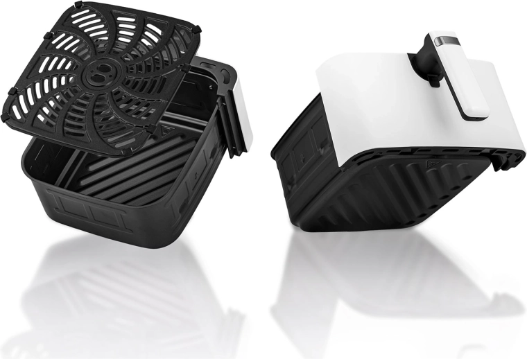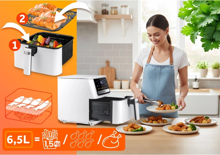 Het intuïtieve touchpanel met kleurrijke iconen en 8 slimme programma’s vereenvoudigt de bereiding van je favoriete gerechten. De grote 6,5 l mand biedt plaats aan een hele diepvriespizza of een maaltijd voor het hele gezin. De uitneembare mand en roestvrijstalen lade met PTFE-antiaanbaklaag kunnen in de vaatwasser – schoonmaken is een fluitje van een cent.