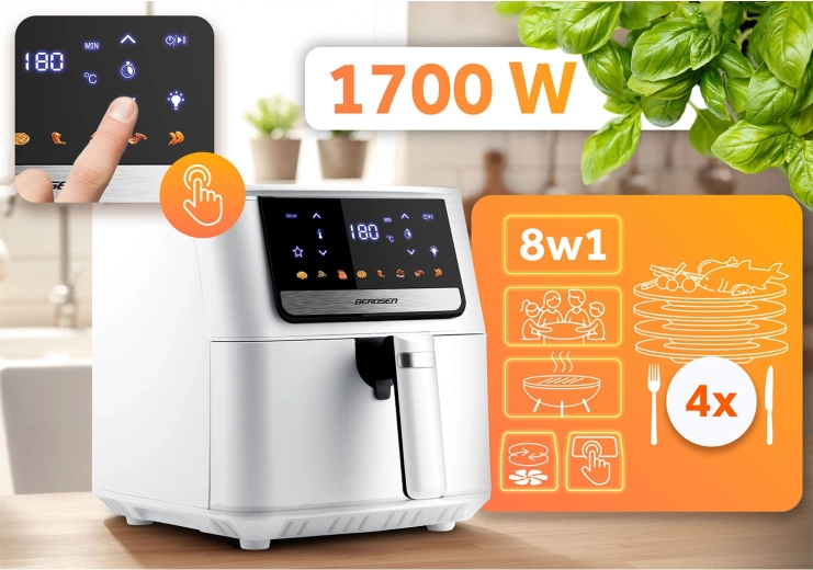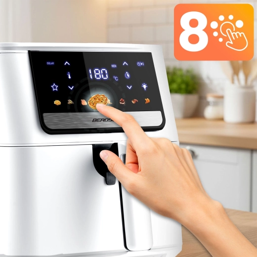 Kook gezonder zonder concessies aan smaak. De BERDSEN friteuse benut moderne heteluchtcirculatie voor egale en snelle bereiding zonder diep te frituren. Instelbare temperatuur tot 200 °C en een timer tot 60 minuten zorgen voor perfecte resultaten bij friet, kip, vis, groenten en gebak.