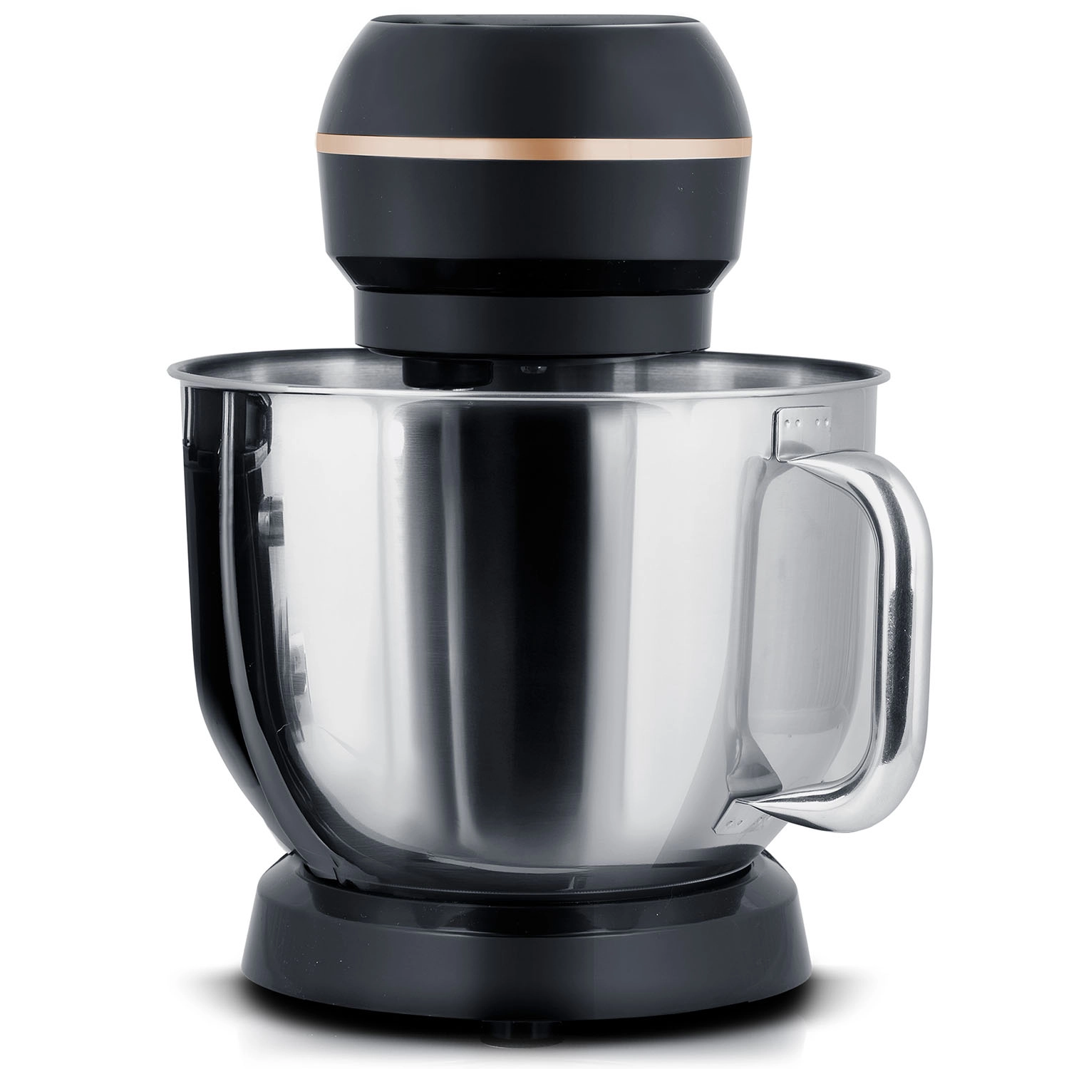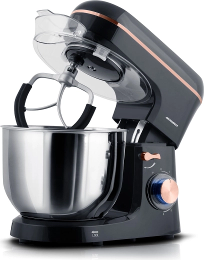 De ruime roestvrijstalen kom (6 l) is corrosiebestendig, eenvoudig te reinigen en minimaliseert met het spatdeksel de rommel tijdens het mengen.