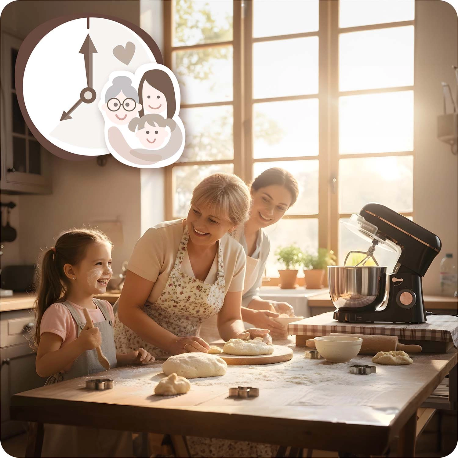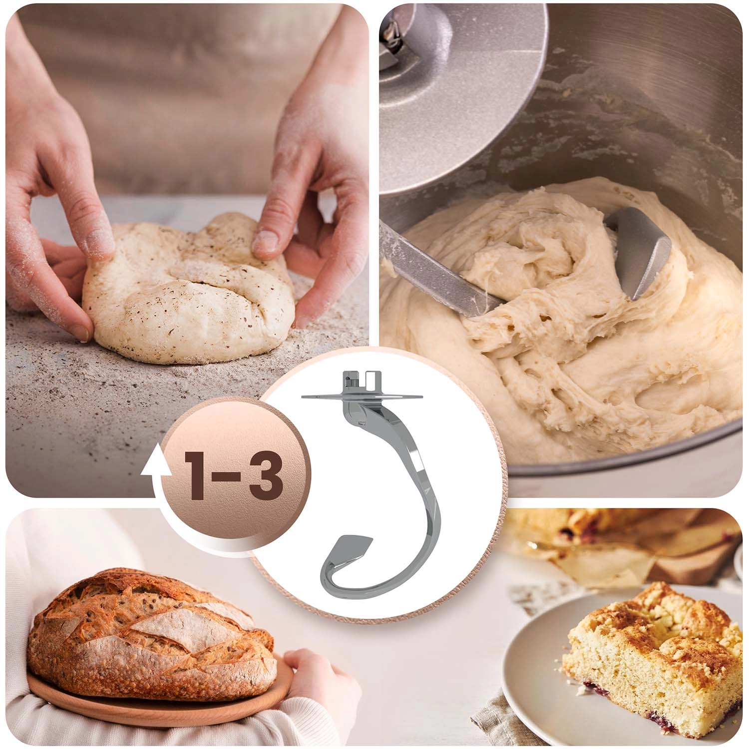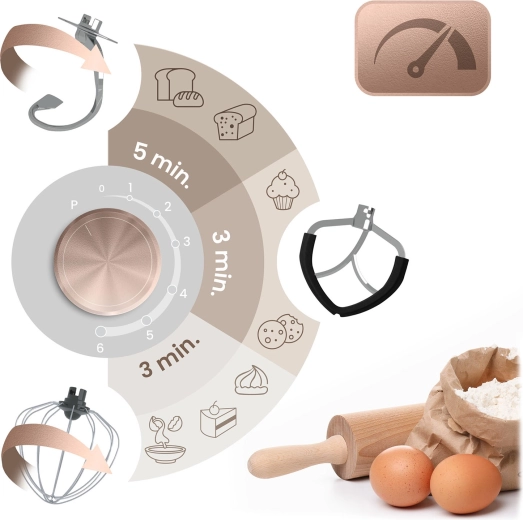 Dankzij 6 snelheidsniveaus en de PULSE-stand past u het vermogen eenvoudig aan de ingrediënten aan: de haak is geschikt voor brooddeeg, de platte menghaak is ideaal voor crèmes en beslag, en de garde klopt eiwitten of room tot perfecte schuimigheid. Een ergonomische kantelkop, antislipvoetjes en veiligheidsvergrendelingen verhogen het gebruikscomfort en de veiligheid.