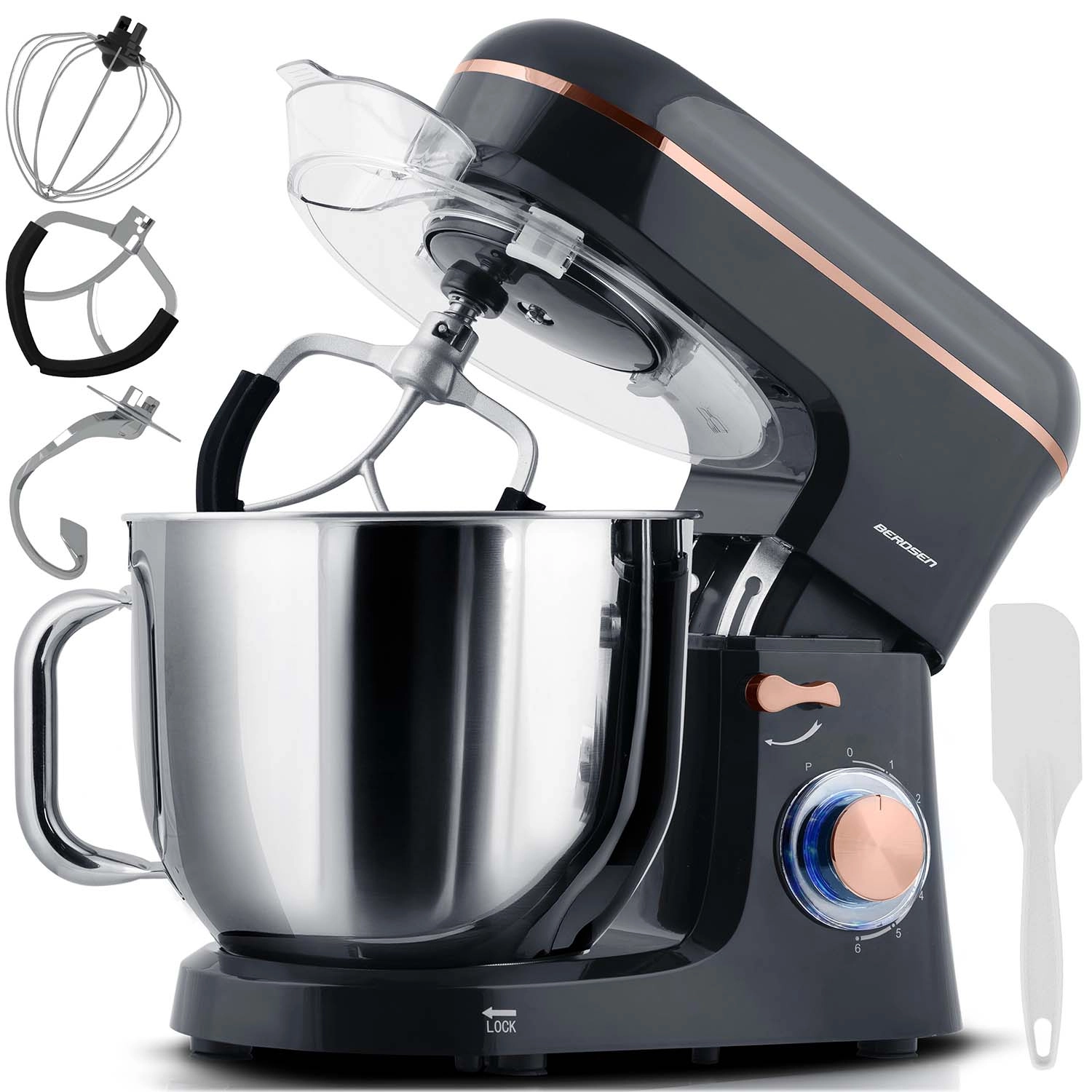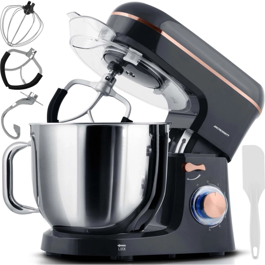 Zoekt u een betrouwbare partner voor bakken en koken? De planetaire robot BERDSEN met een koperen motor van 1400 W en een metalen overbrenging levert stabiele prestaties, ook bij stevig deeg. De grote 6-liter roestvrijstalen kom met spatdeksel zorgt voor een schoon werkblad en voldoende ruimte voor dagelijkse en feestelijke lekkernijen.