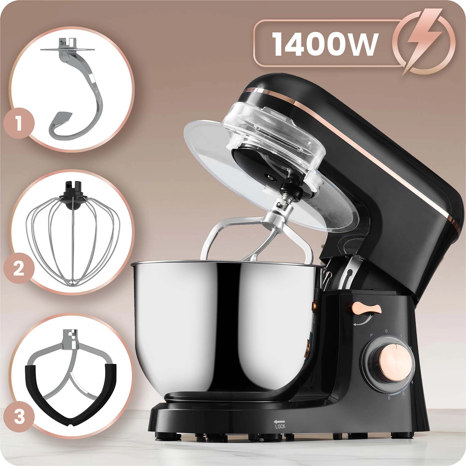 - 3 opzetstukken inbegrepen: deeghaak, platte menghaak, garde