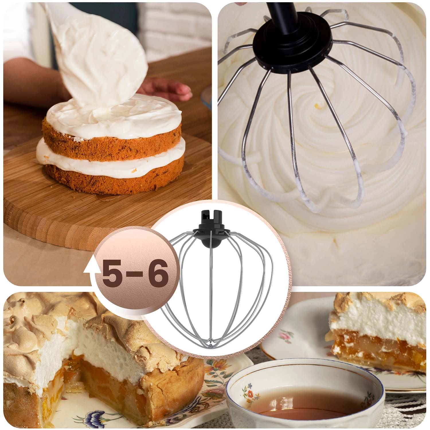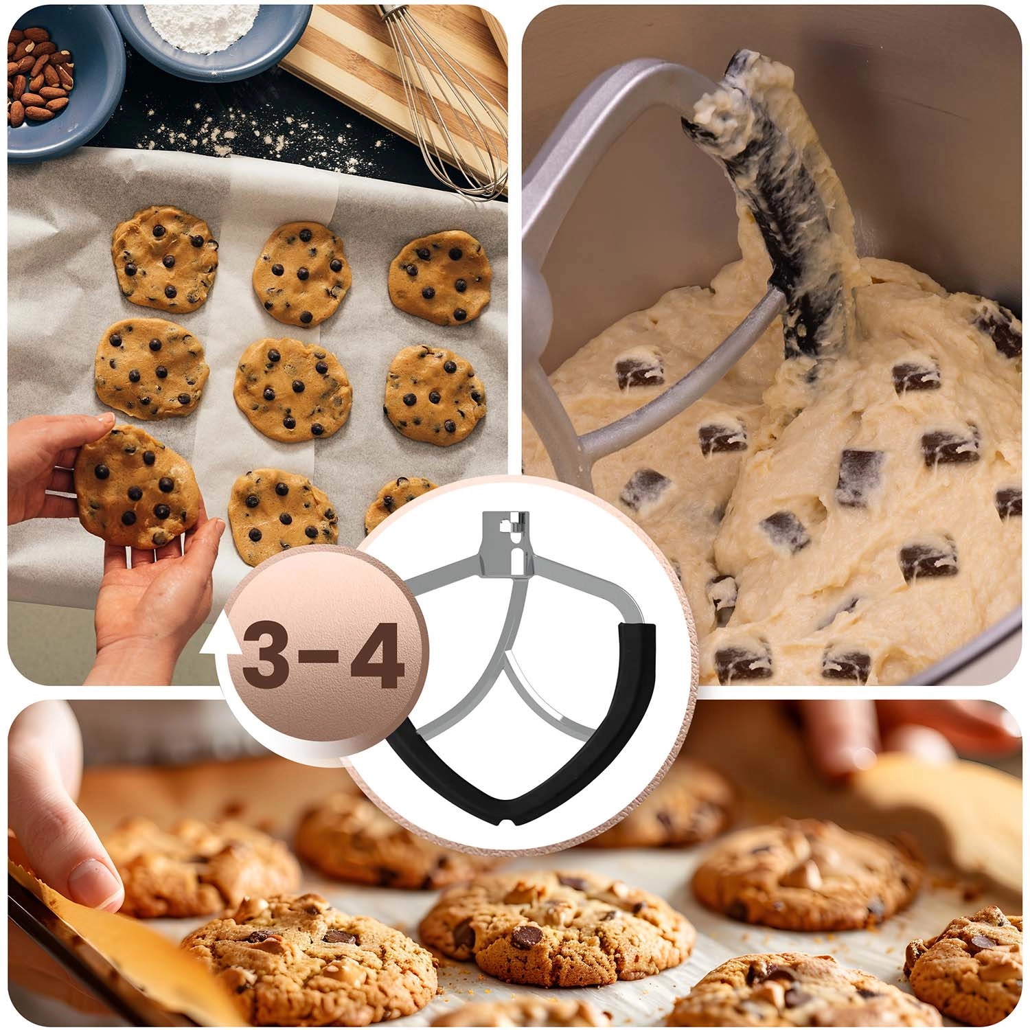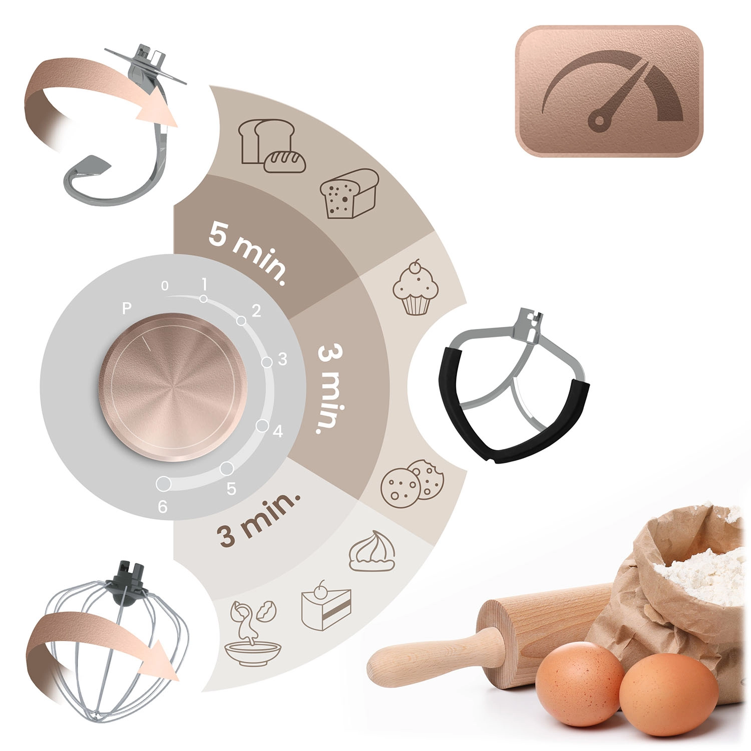 De set bevat een deeghaak (snelheden 1–3), een platte menghaak (2–4) en een garde (5–6) voor de perfecte consistentie bij elk recept.