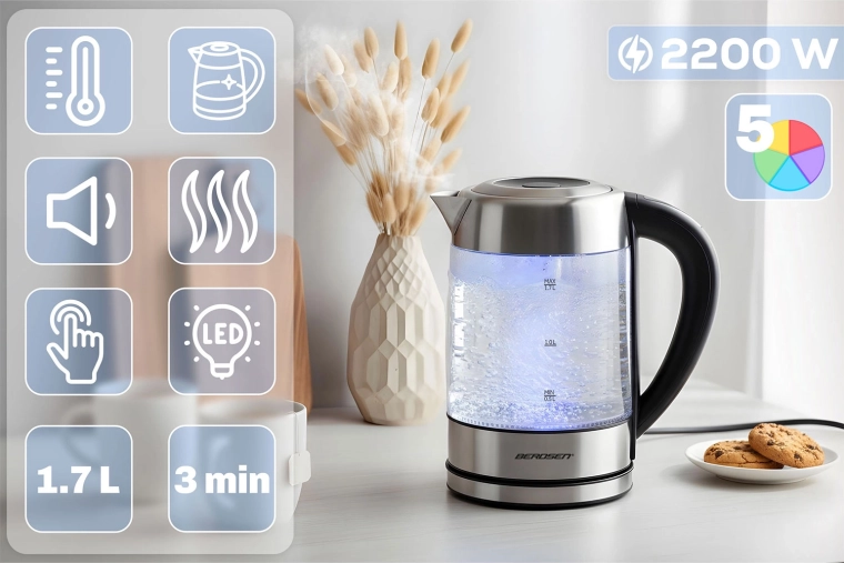 Ontdek de moderne glazen waterkoker van BERDSEN met een inhoud van 1,7 l en een vermogen van 2200 W voor snel en precies verwarmen van water. Dankzij touchbediening, slimme realtime temperatuursmeting en temperatuurinstelling van 60–100 °C bereid je thee, koffie en babydrankjes precies zoals nodig. LED-achtergrondverlichting geeft de verwarmingsfase aan, borosilicaatglas zorgt voor zuivere smaak en duurzaamheid en de beveiliging tegen droogkoken biedt gemoedsrust tijdens het gebruik.
