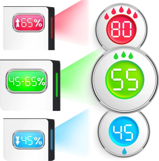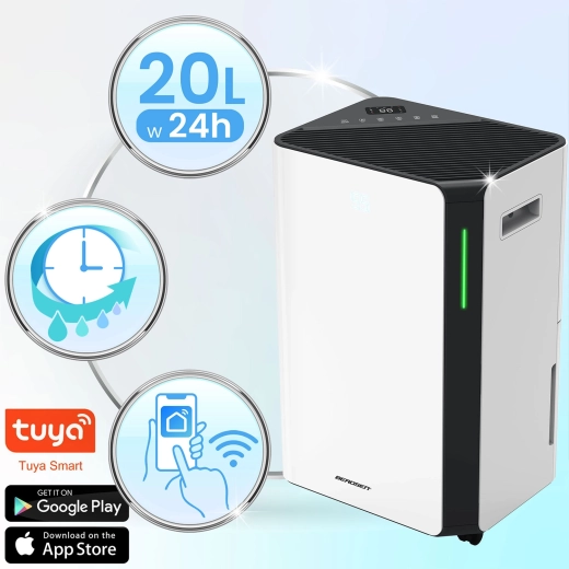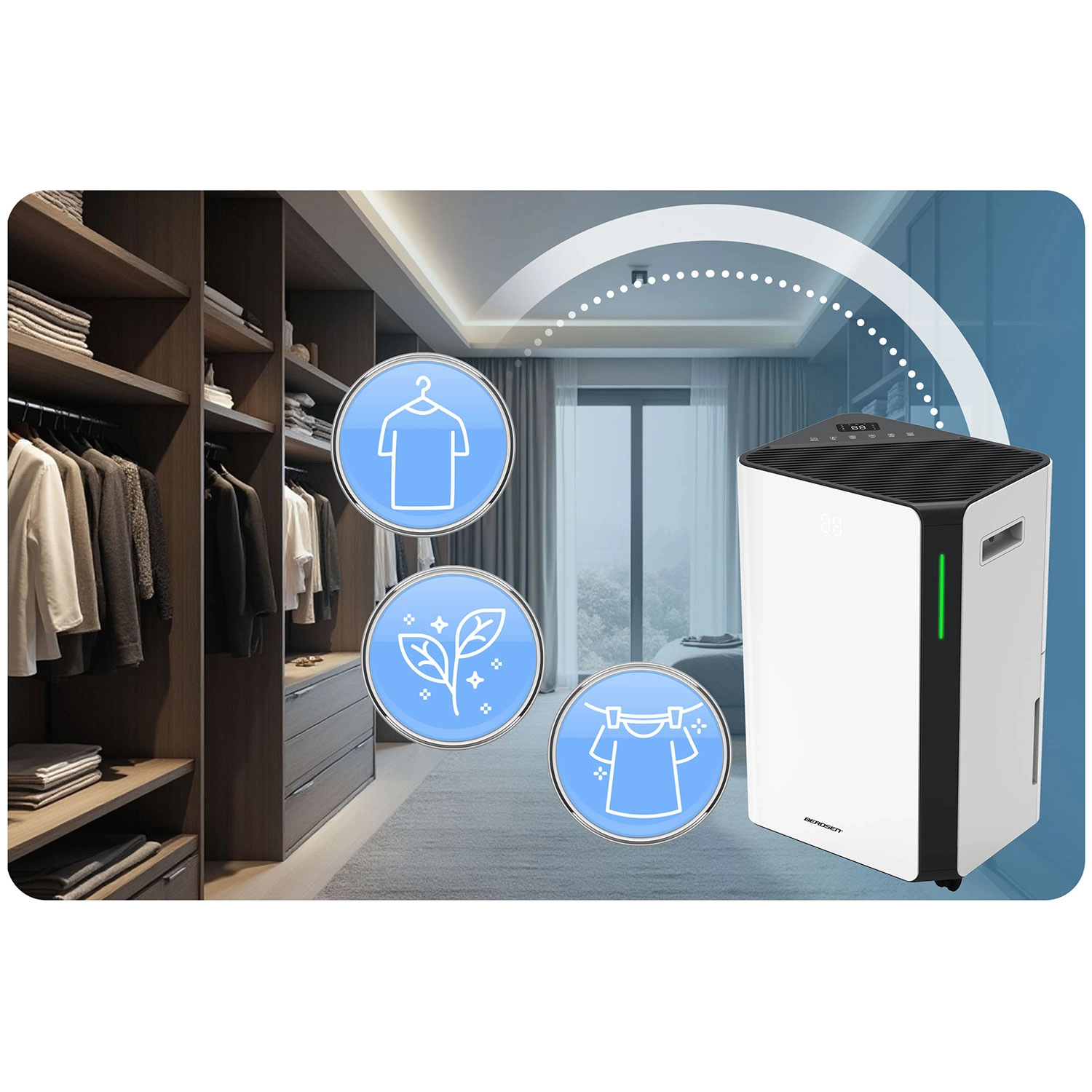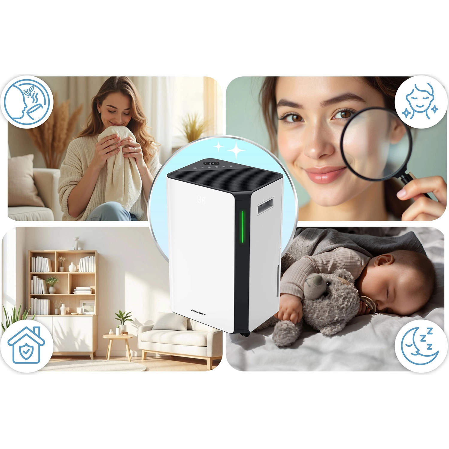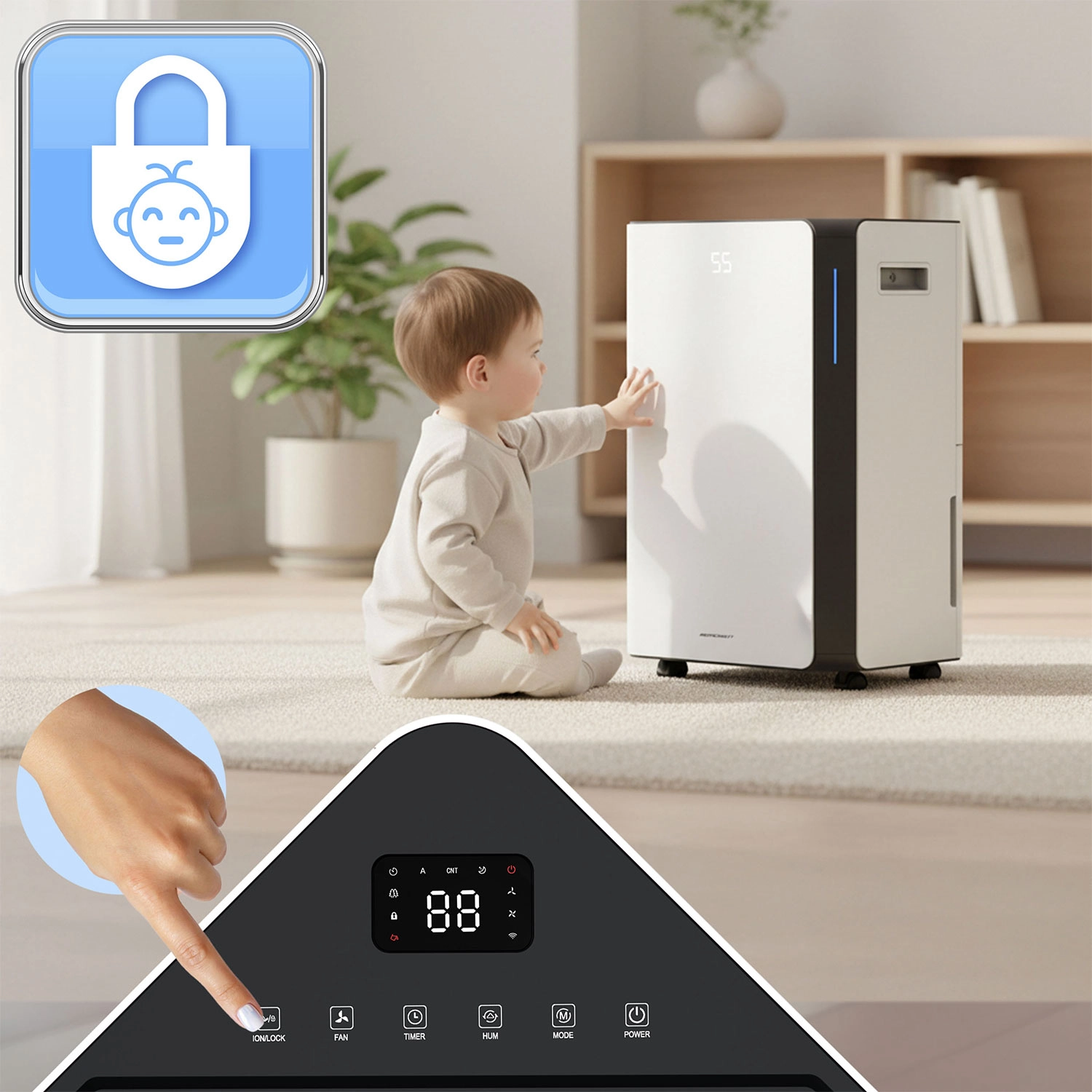 Bedien het apparaat lokaal via het touchpanel of op afstand via Wi‑Fi en de Tuya/Smart Life‑app. Beschikbaar zijn een timer 1–24 u, kinderbeveiliging, nachtmodus (Sleep) met gedimd display en een driekleurige LED‑indicator voor vochtigheid: rood (≥65%), groen (45–65%), blauw (≤45%). De stille werking ≤ 41 dB stoort niet tijdens werk of slaap.