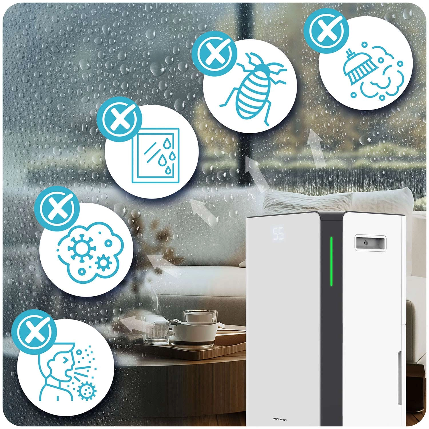 Het model BERDSEN BD-532 verlaagt de luchtvochtigheid efficiënt via condensatie, waardoor schimmel-, zwam- en bacterievorming wordt beperkt en muffe geuren worden geëlimineerd. Ideaal voor appartementen, kantoren en recreatiewoningen. De geïntegreerde hygrostaat behoudt het gekozen vochtigheidsniveau binnen 30–80% RV.
