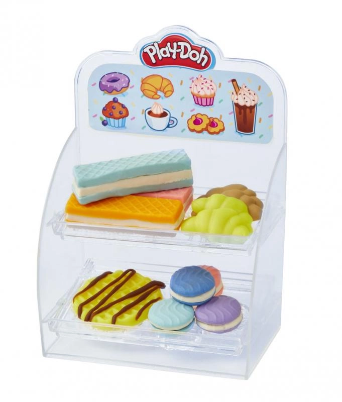 - Drankjesmachine met hendel, “slagroom”-station, vormpjes voor koekjes/cupcakes/donuts, bekertjes en gereedschap, transparante vitrine, 8 potjes Play-Doh-klei, in totaal 20 accessoires