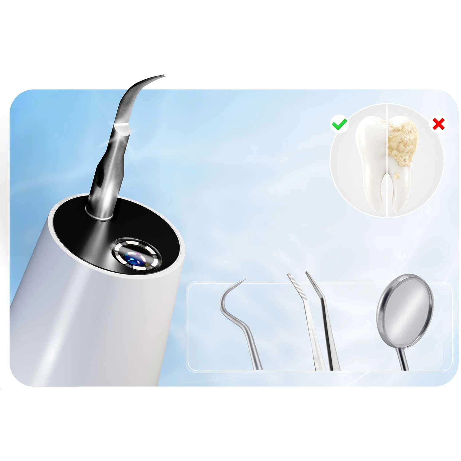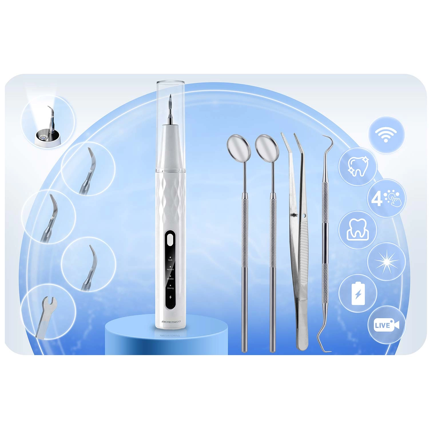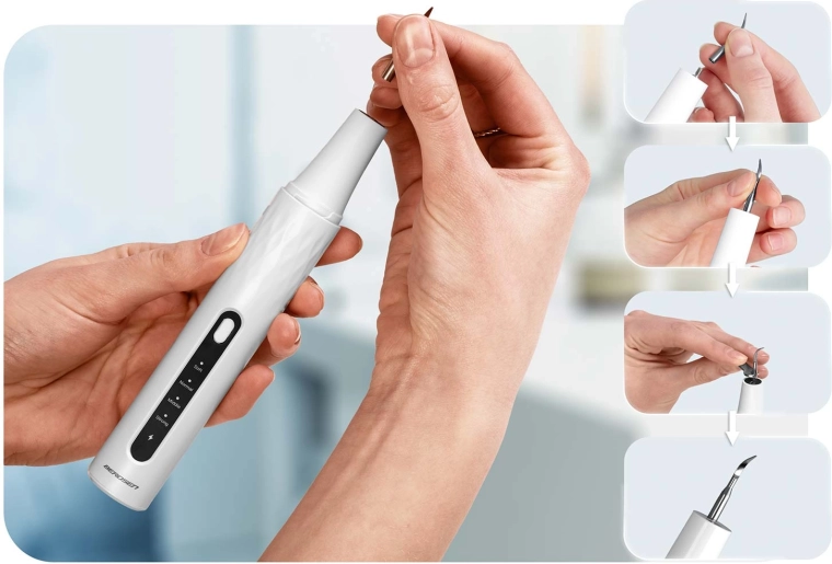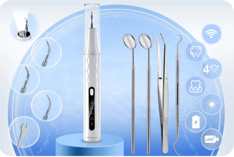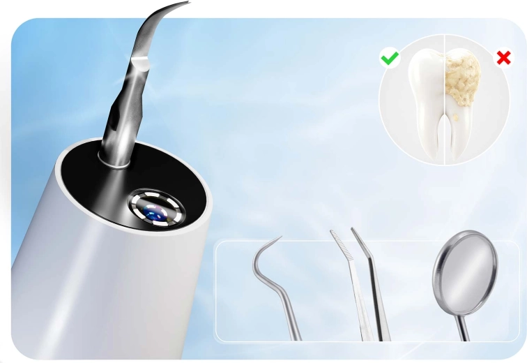 Professionele mondzorg thuis. De ultrasone scaler van BERDSEN met geïntegreerde 2 MP‑camera en LED‑verlichting laat je precies zien waar zich tandsteen en tandplak bevinden. Biedt 4 werkmodi (35–45 kHz) voor alle gevoeligheden, automatische stop bij aanraking van zacht weefsel, IPX7‑waterbestendigheid, lange batterijduur met USB‑C opladen en rijk accessoirespakket met 4 verwisselbare opzetstukken en een set roestvrijstalen tandheelkundige instrumenten. Ideaal voor veilig en doeltreffend reinigen in het comfort van je eigen huis.