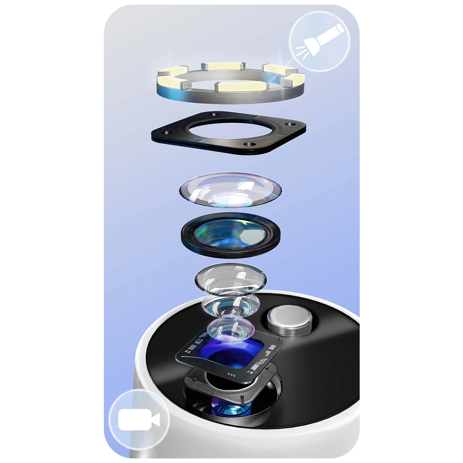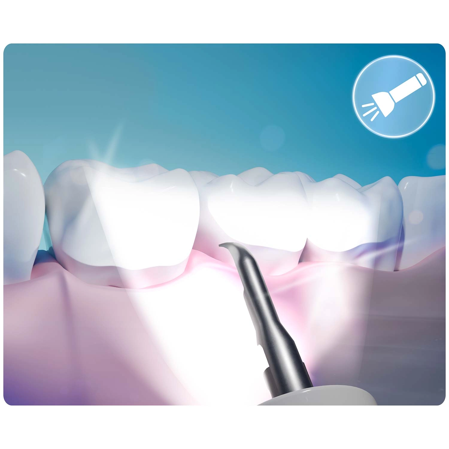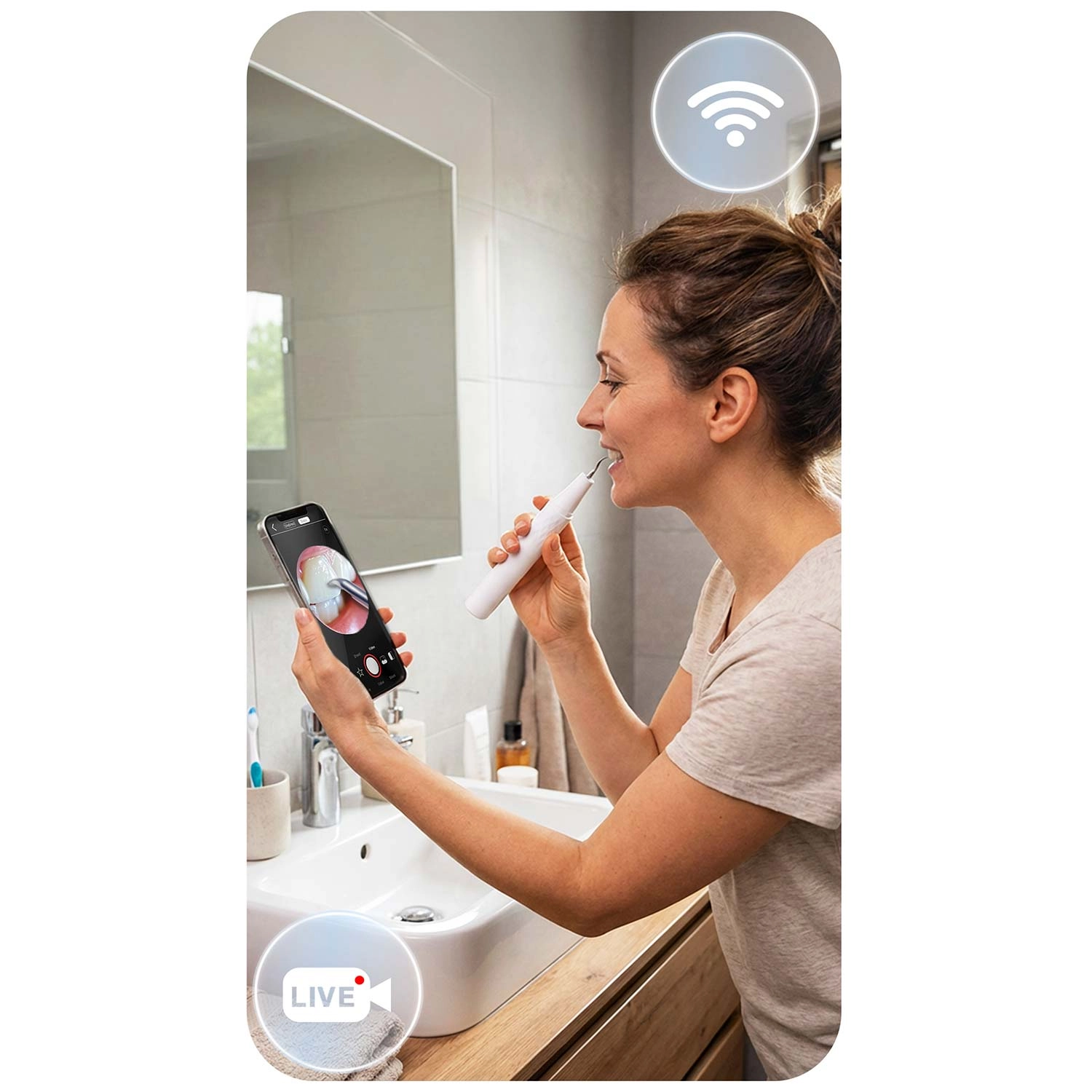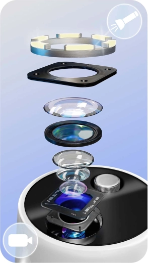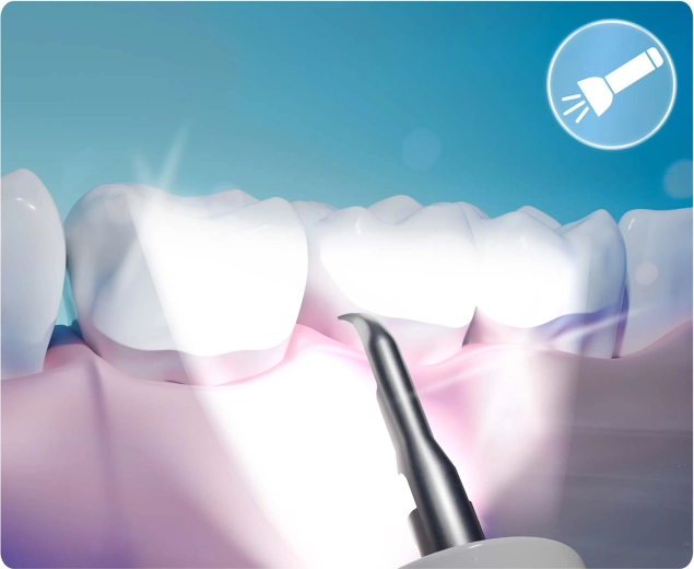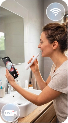 Zie wat je reinigt – volledige controle en precisie. De geïntegreerde 2 MP‑camera met LED’s streamt live beeld naar een mobiele app. Zo herken je eenvoudig tandsteen, verkleuringen en moeilijk bereikbare plekken en verwijder je alleen wat nodig is – zonder onnodige irritatie of giswerk.