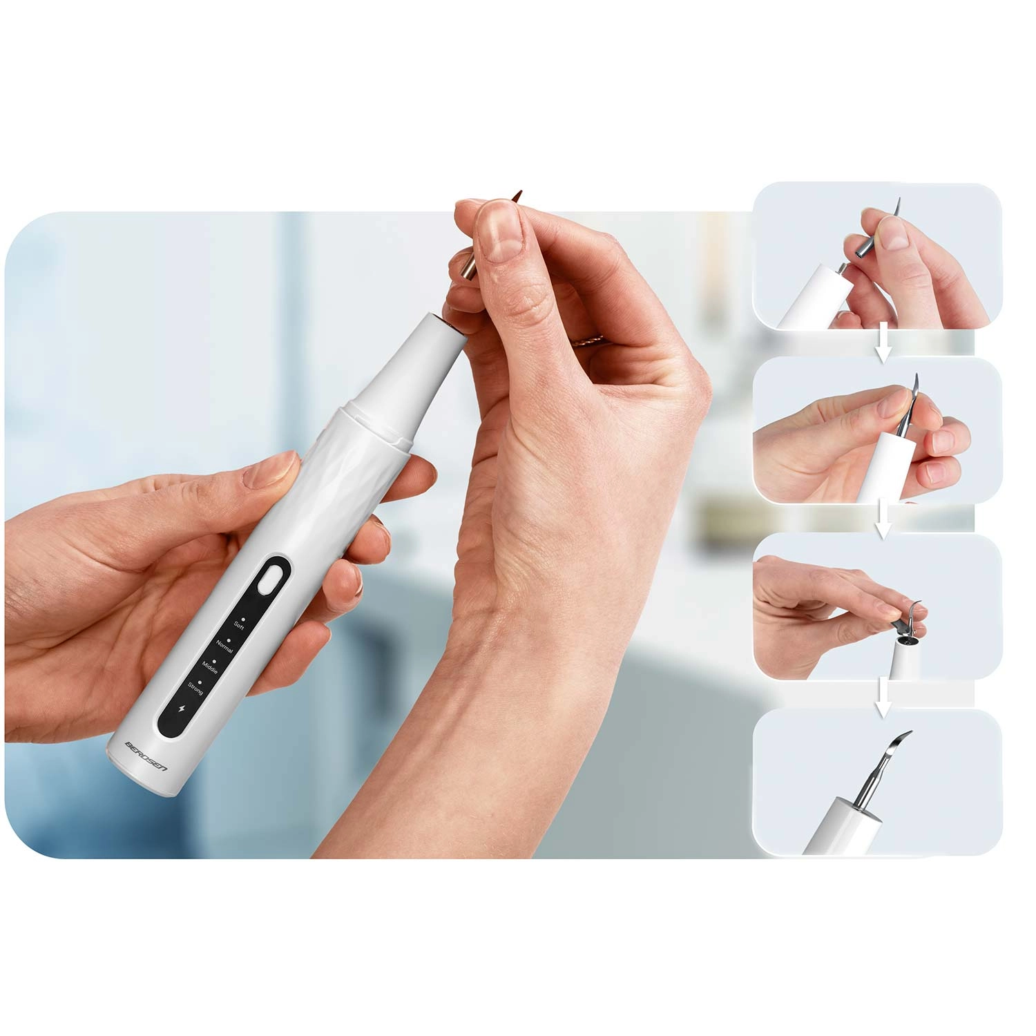 - STRONG (42–45 kHz) – effectief bij hardnekkige tandsteen.