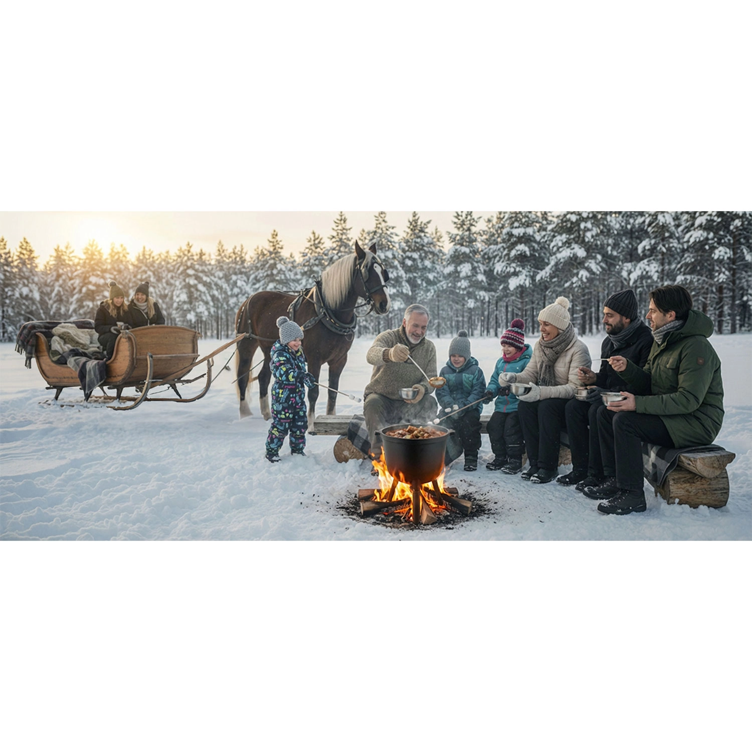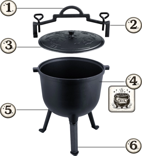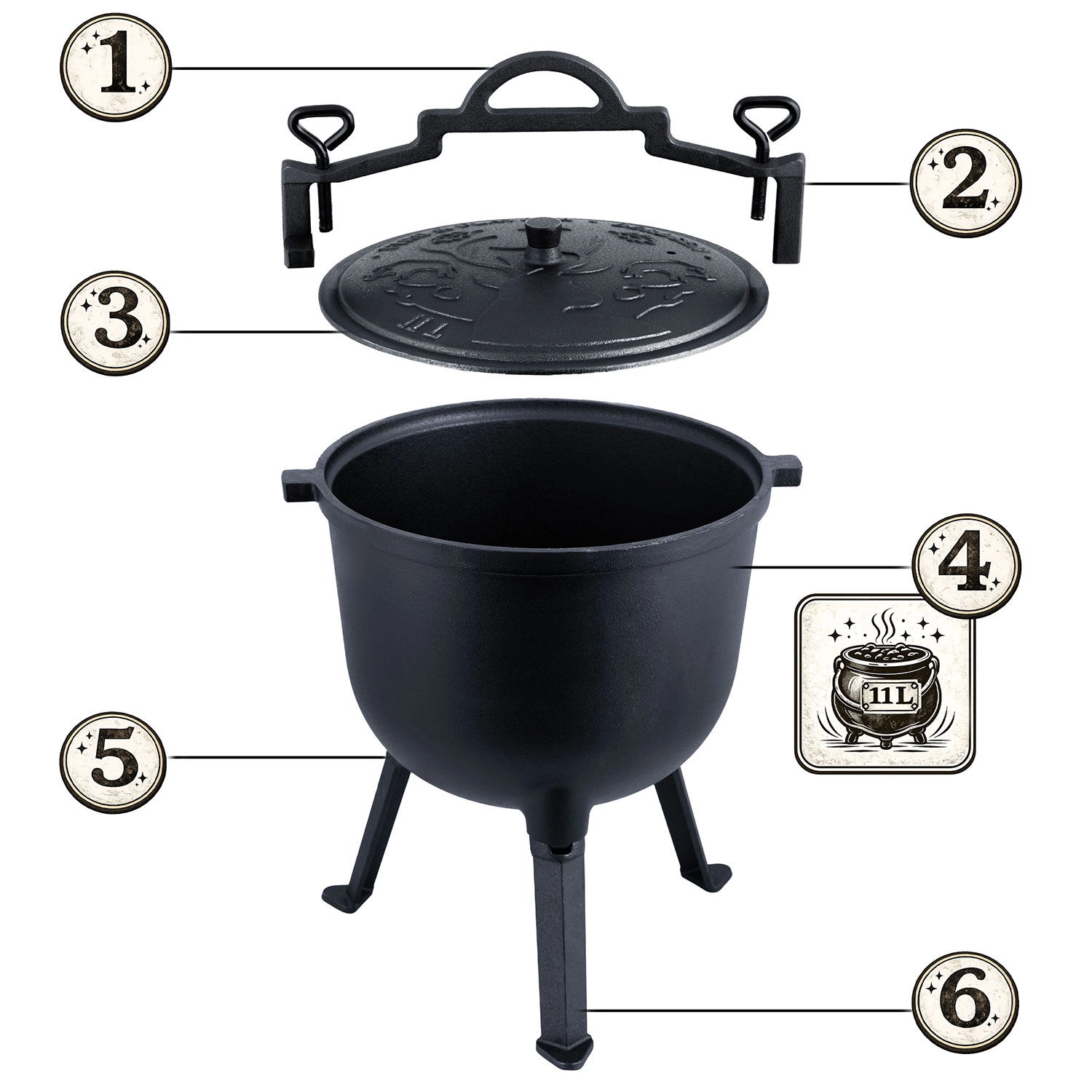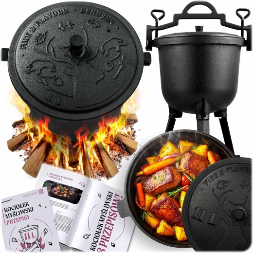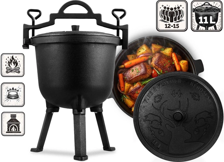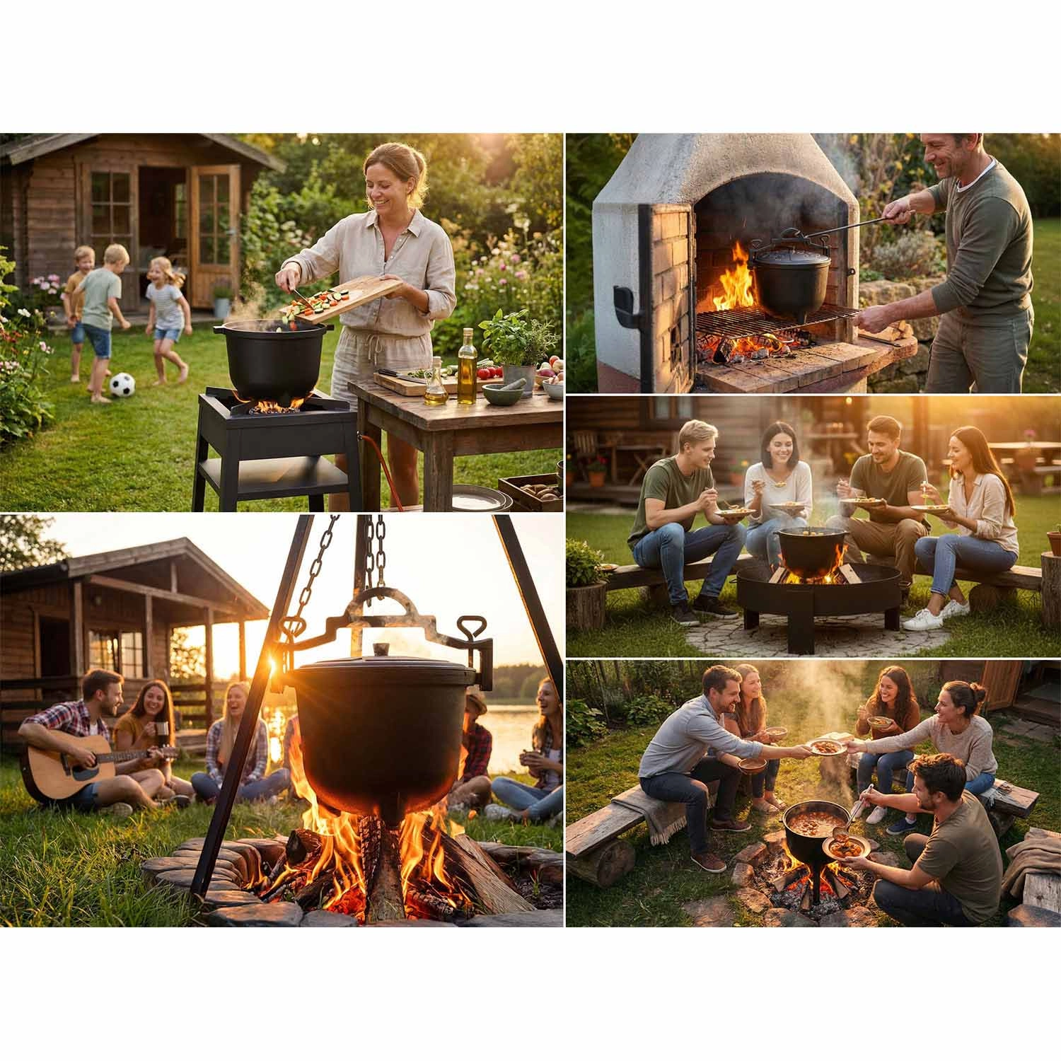 De traditionele gietijzeren ketel is ideaal voor open vuur, tuinbarbecue en gasfornuis. De massieve constructie zorgt voor stabiliteit, langdurige warmtevastheid en langzaam stoven – vlees valt mooi uit elkaar en groenten nemen de smaak op. Het zware deksel met ventilatie houdt stoom en aroma binnen, zodat het resultaat altijd sappig en vol van smaak is.