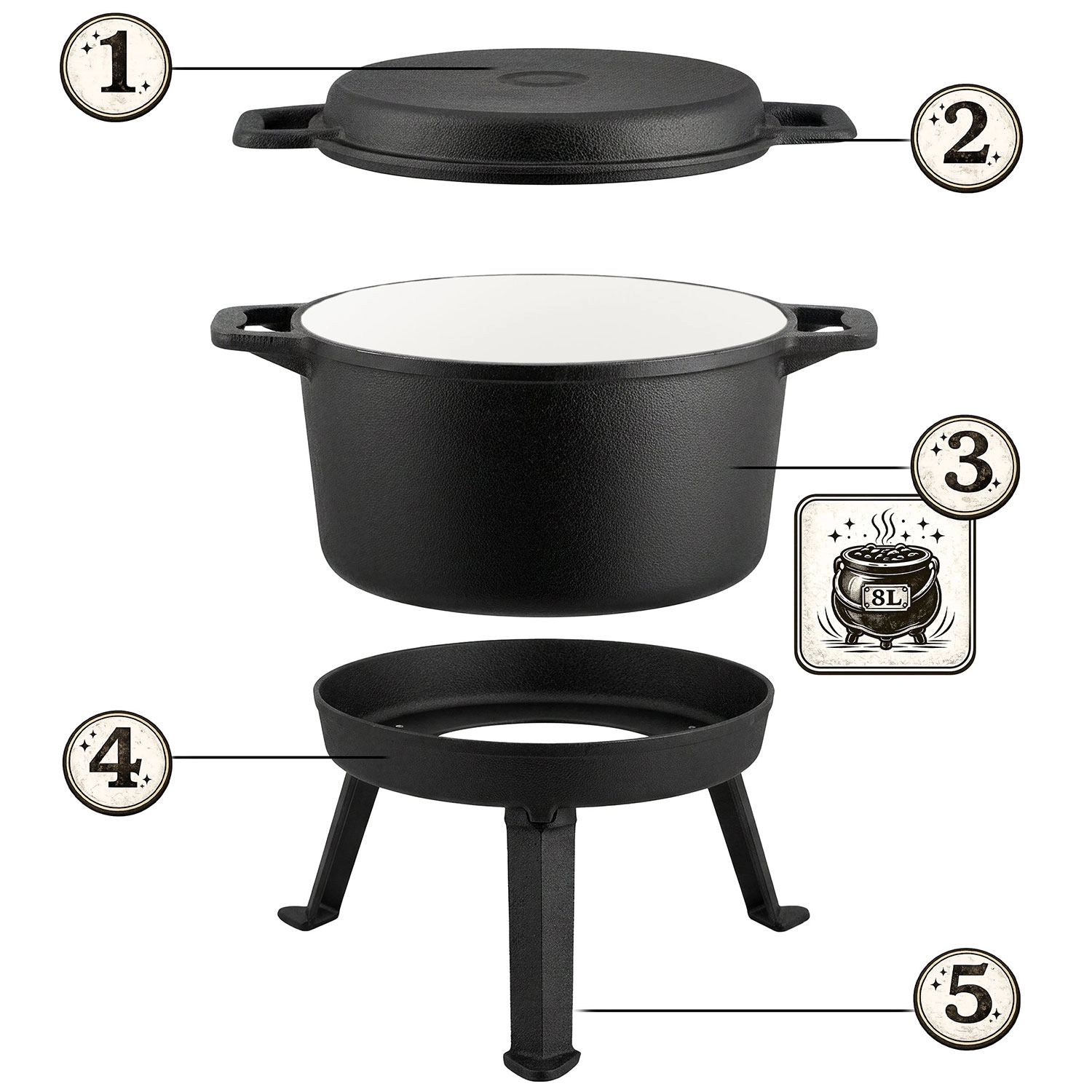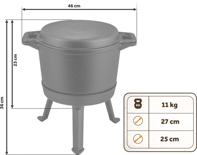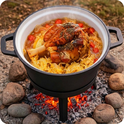 Deze robuuste gietijzeren ketel met interne emaille is ideaal voor het bereiden van goulash, braadschotels, bigos of bonenmengsels boven het vuur, op de grill en zelfs op een gasfornuis. Dankzij de inhoud van 8 l voedt u zonder problemen zowel het gezin als een groep vrienden, en de dikke wanden helpen een stabiele temperatuur te behouden voor langzaam garen en sappige resultaten.