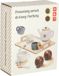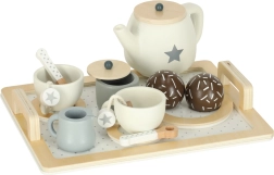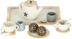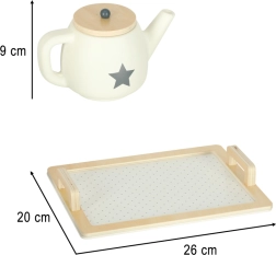 Elegant houten theeservies in neutrale kleuren met sterrendetails, ideaal voor kinder-theemomenten. Kinderen kunnen thee, melk en “dessert” serveren, beleefdheid en communicatie oefenen en tegelijkertijd hun fantasie ontwikkelen.