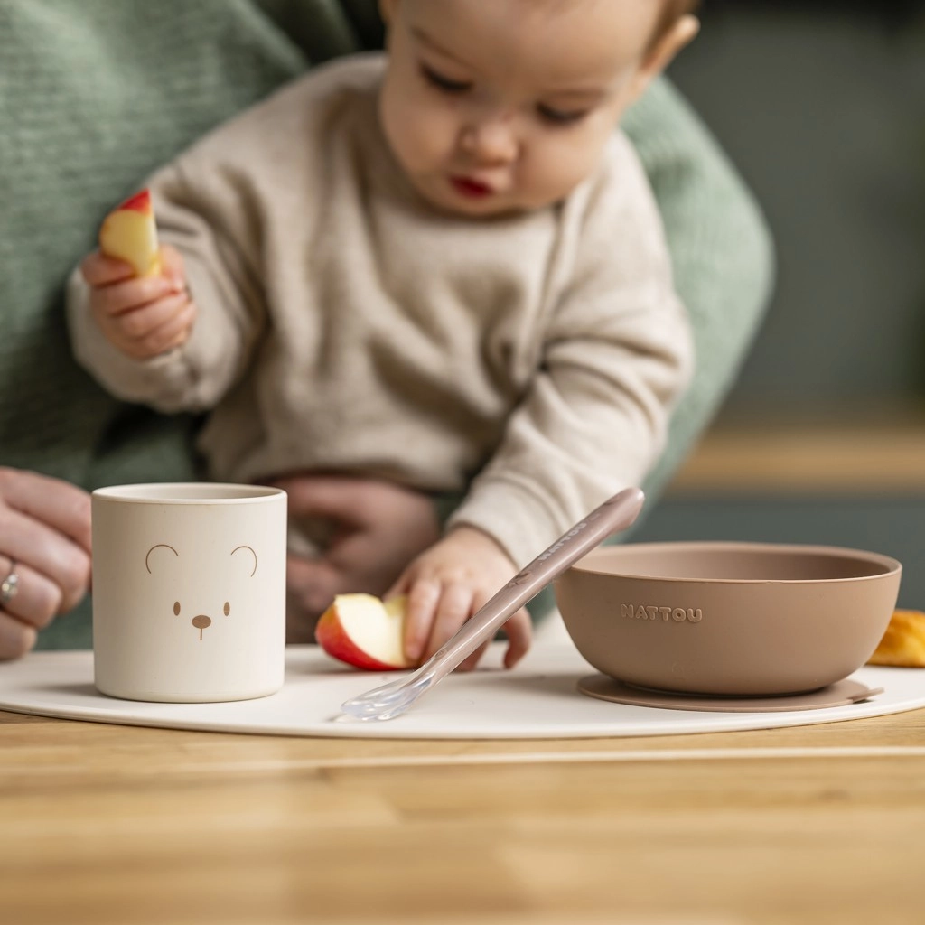 Zowel het bord als de kom hebben een sterke zuignapbodem die het servies stevig op tafel houdt en helpt ongelukken te voorkomen. De ergonomische lepel is afgestemd op kleine handjes en mondjes, zodat kinderen er makkelijker mee kunnen eten. De beker is licht, goed vast te pakken en ideaal om drinkvaardigheden te oefenen.
