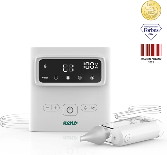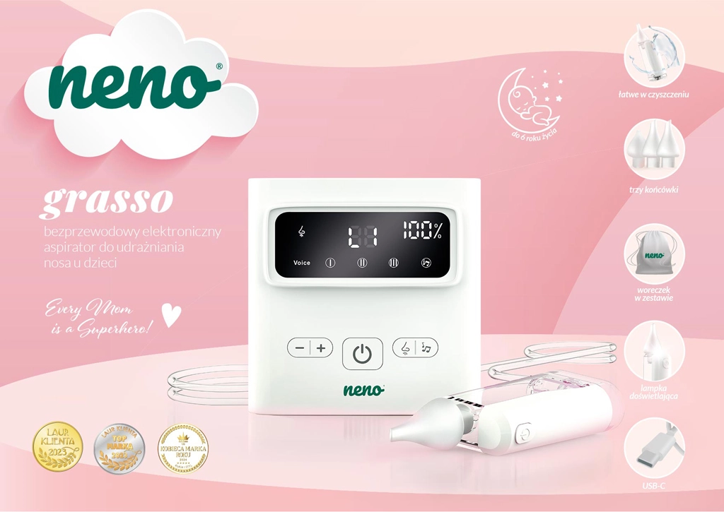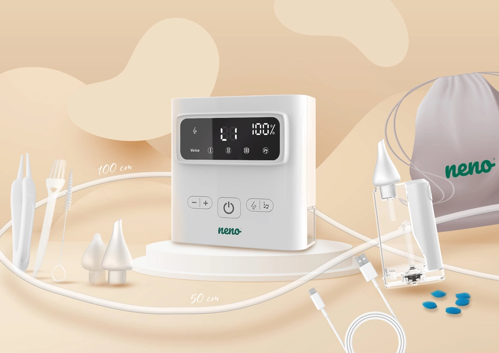 Dankzij de draadloze werking, USB‑C‑opladen en het compacte formaat is de Neno Grasso ook ideaal voor op reis. In de verpakking vindt u complete accessoires, inclusief een beschermetui, slangetjes, filters en reinigingshulpmiddelen – alles wat u nodig heeft voor veilig en comfortabel gebruik vanaf de geboorte tot 6 jaar.