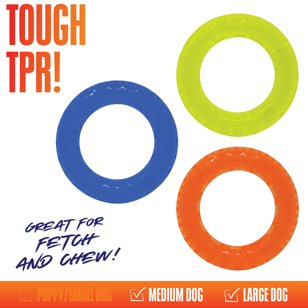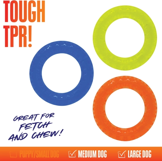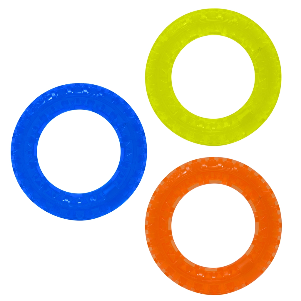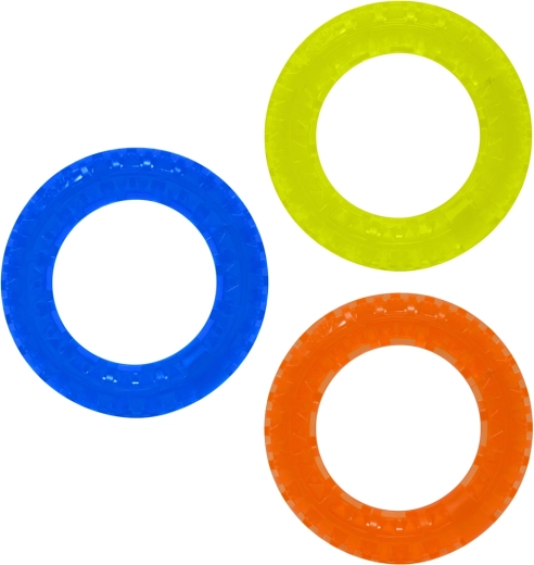 De NERF DOG set bevat drie transparante of halftransparante TPR‑ringen die zijn ontworpen voor leuk apporteren, werpen en dragen. Dankzij het flexibele materiaal, de opvallende kleuren en de spiky textuur zijn ze gemakkelijk te vangen, goed te volgen in beweging en masseren ze het tandvlees zachtjes tijdens het spel.