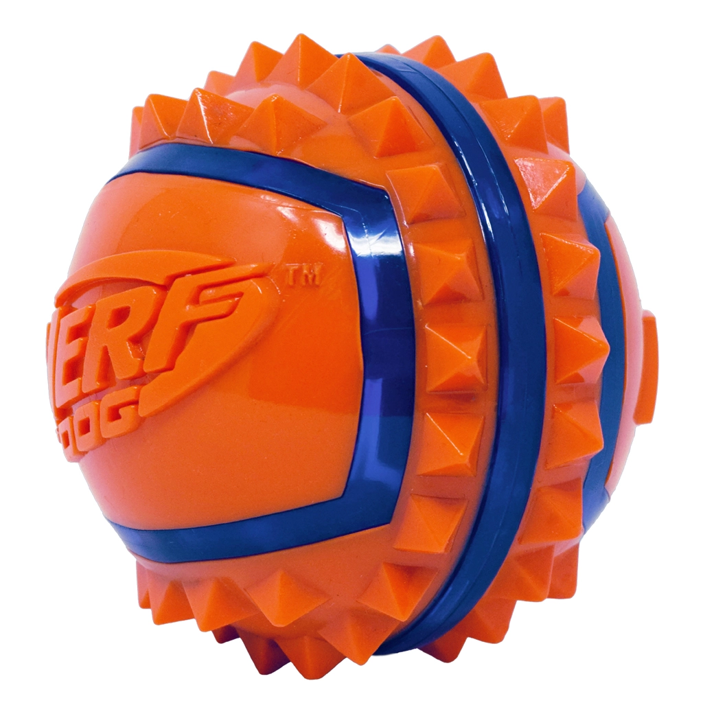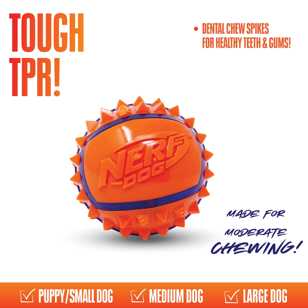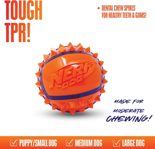Nerf Dog stekelige bal voor honden 9 cm brengt honden plezier in beweging en eigenaren comfortabel gooien en dragen. Hoogwaardig thermoplastisch rubber (TPR) verenigt stevigheid, veerkracht en duurzaamheid, waardoor het geschikt is voor regelmatig gebruik. Dankzij de contrasterende kleuren is de bal gemakkelijk zichtbaar, ook tijdens snel spel in de buitenlucht.
