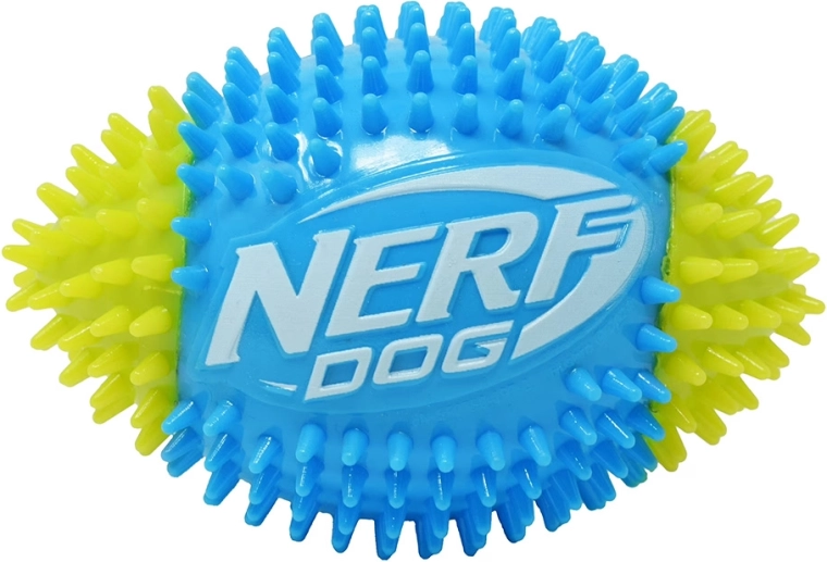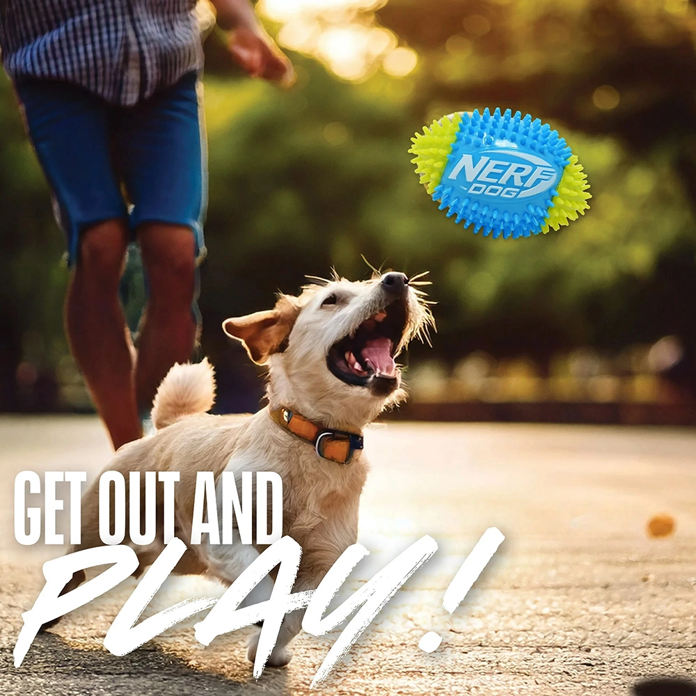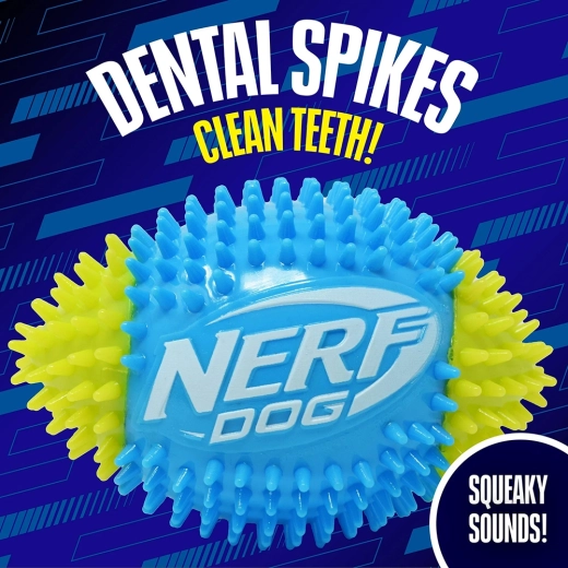 De Nerf Dog piepende voetbal met noppen zorgt voor dynamisch, interactief speelplezier voor honden die van beweging houden. Het duurzame thermoplastische rubber (TPR) biedt veerkracht, een lange levensduur en is vriendelijk voor tanden. Het getextureerde oppervlak met noppen verbetert de grip tijdens het apporteren, ondersteunt natuurlijk kauwen en masseert het tandvlees.