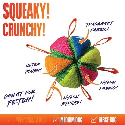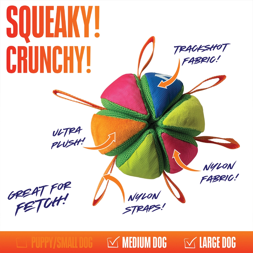 Dankzij de meerdere nylon lussen is de bal gemakkelijk vast te pakken, te dragen en te trekken. Speciale snackvakjes voegen een beloning toe aan het spel en verlengen het speelplezier. De versterkte Trackshot-stof en de stevige naden zorgen voor uitzonderlijke duurzaamheid, zelfs bij intensief gebruik.