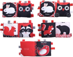 Bereid uw kind voor op een magische reis van het ontdekken van vormen en patronen met dit geweldige boek. Het boek is ontworpen in contrasterende kleuren zoals zwart, wit en rood, die ideaal zijn voor visuele stimulatie van jonge kinderen. Het boek bevat vier textiele pagina's met dieren zoals een vogeltje, konijntje, uil, vos, beer, eekhoorn en wasbeer.