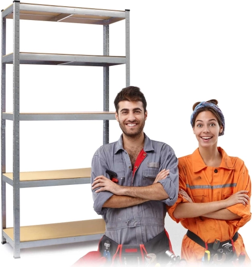 Universele metalen stelling voor garage, kelder of werkplaats met afmetingen 180 × 90 × 40 cm, voorzien van 5 verstelbare MDF legplanken, draagvermogen 175 kg per plank en schroefloze klikmontage. Dankzij de verzinkte profielen is hij stabiel en duurzaam; kan worden opgedeeld in twee kleinere stellages of gebruikt als werkbank.