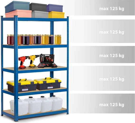 Duurzame stalen constructie met gegalvaniseerde profielen en 5 stevige MDF-legplanken kan zware omstandigheden in professionele en huishoudelijke omgevingen aan. Elke plank draagt tot 125 kg, zodat je zonder zorgen gereedschap, boxen en voorraden kunt opbergen. Dankzij de middenverstevigingen is de opslag stabiel en gelijkmatig verdeeld.