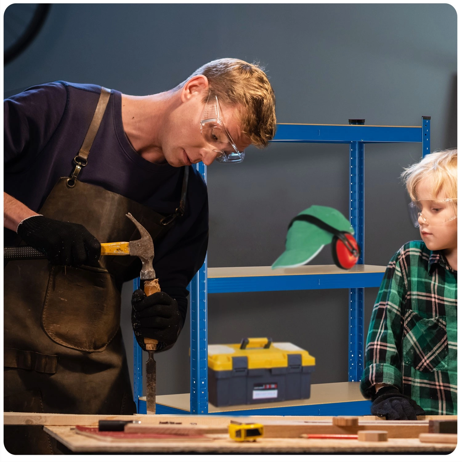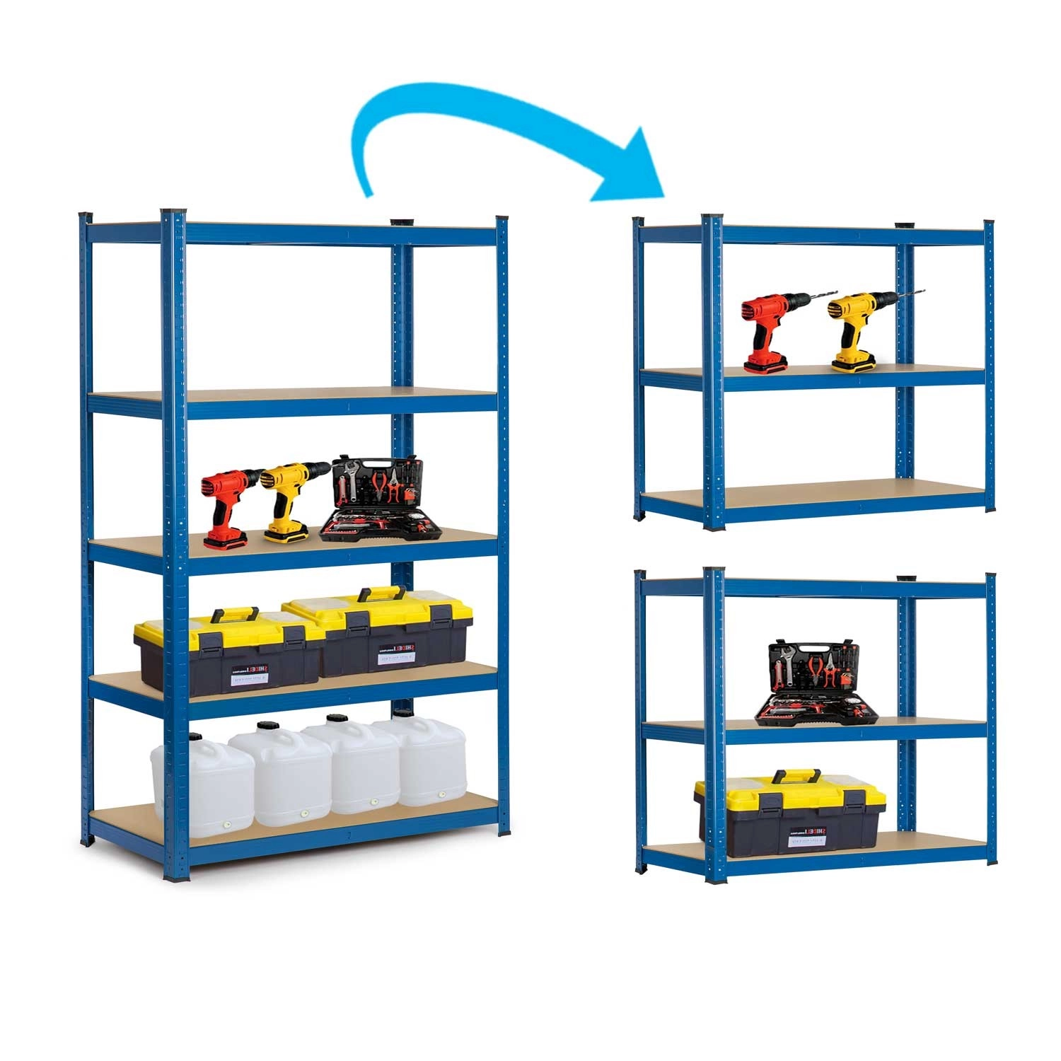 Monteer als een hoge stelling met vijf legplanken, splits in twee kleinere of gebruik als werktafel in de werkplaats.