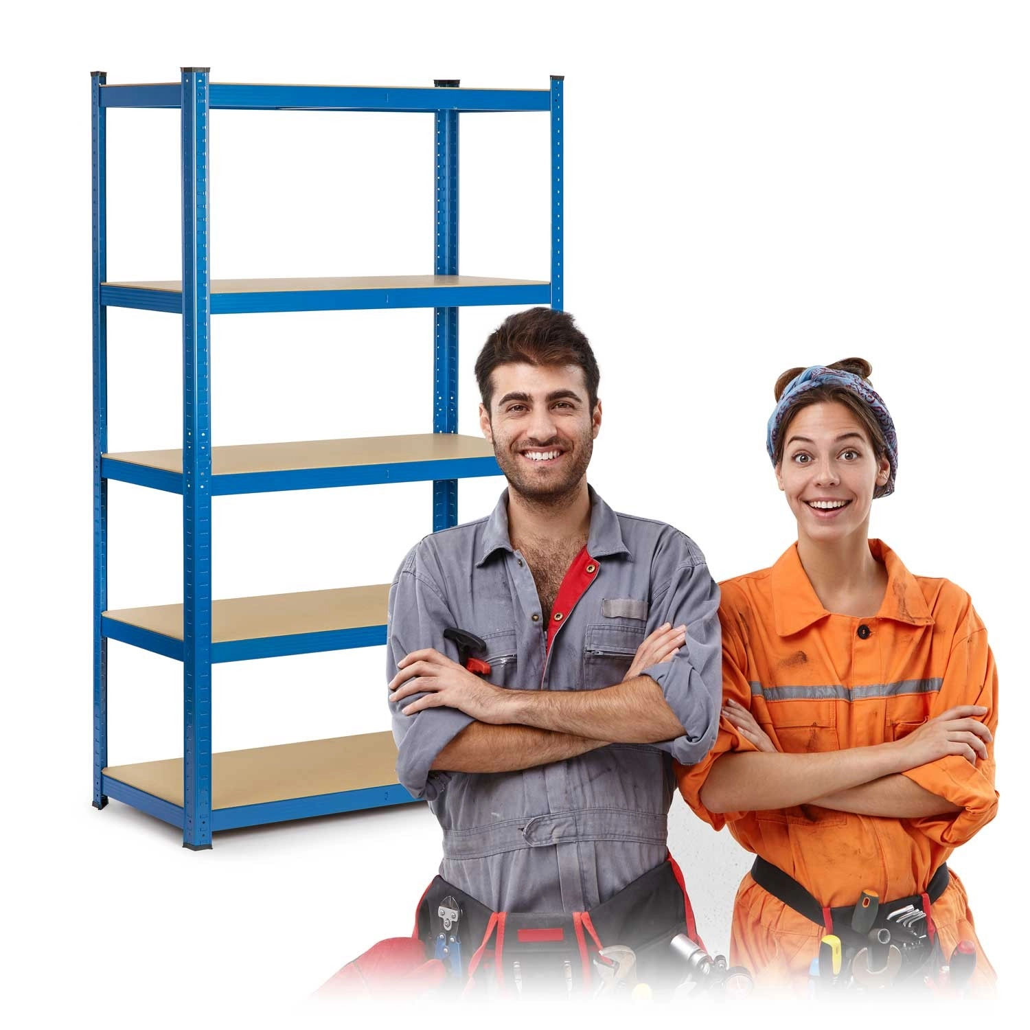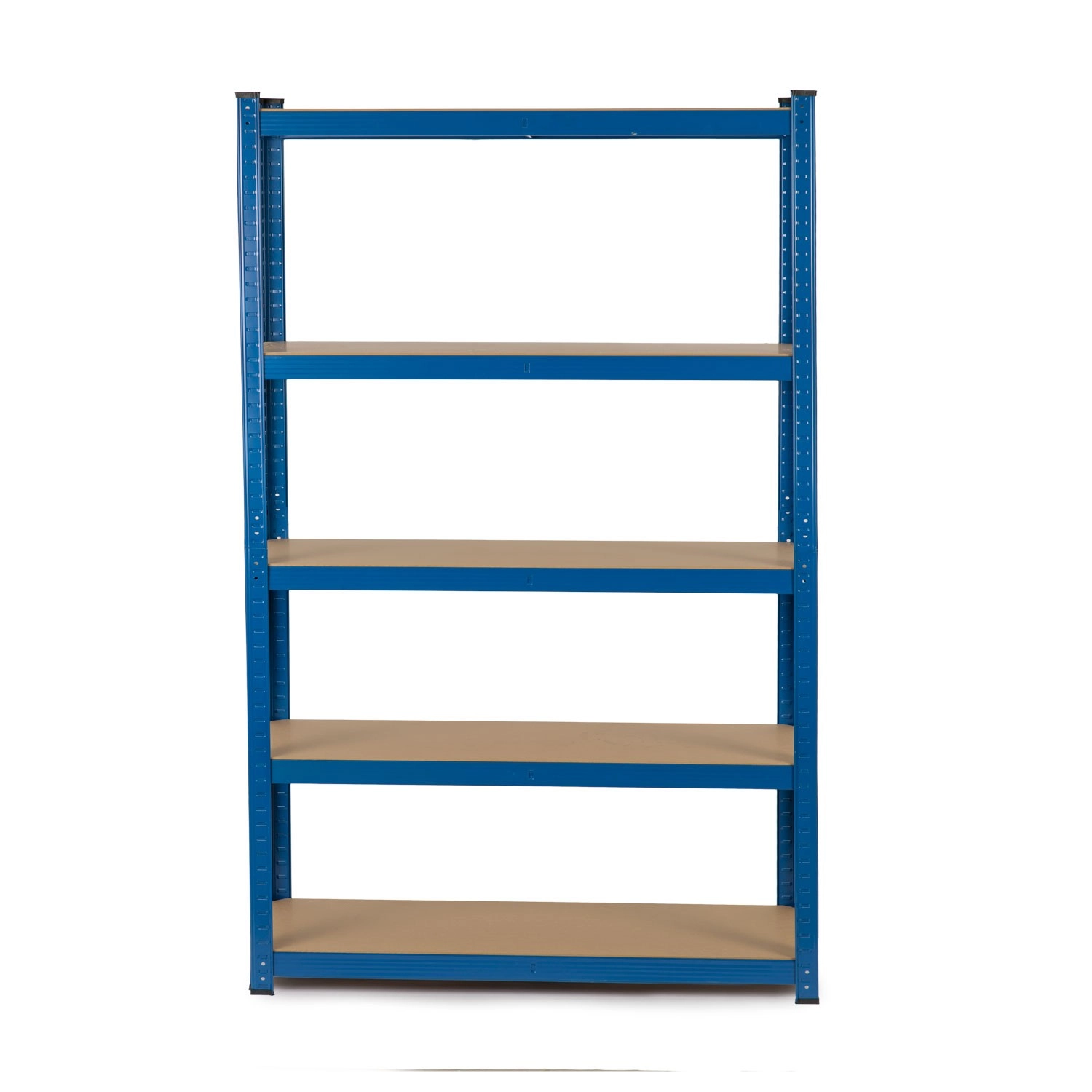 Het stalen frame met middengordingen en 5 MDF-legplanken draagt tot 625 kg. Een stabiele oplossing voor boxen, gereedschap en voorraden.