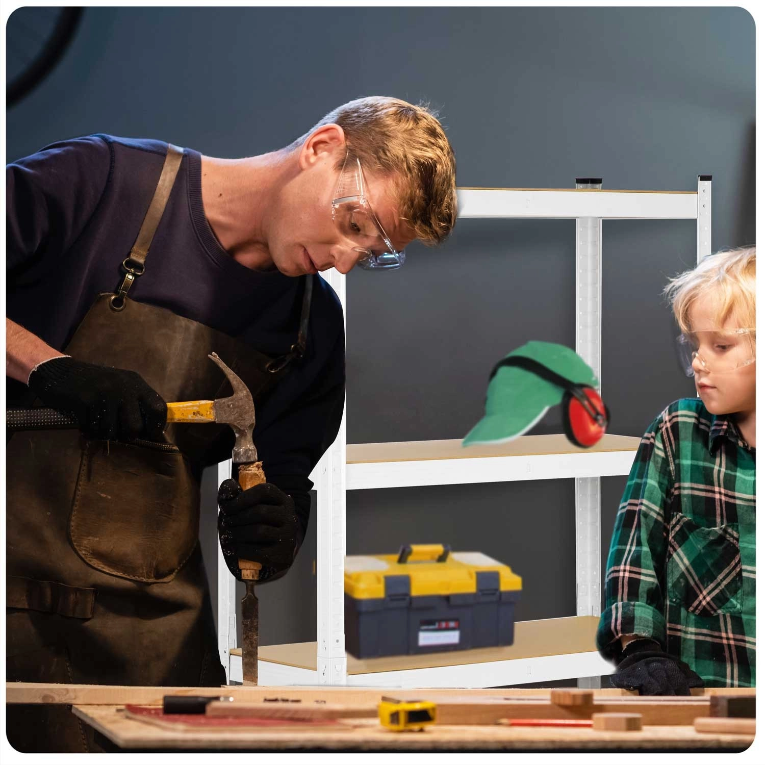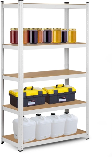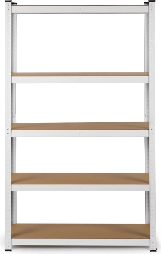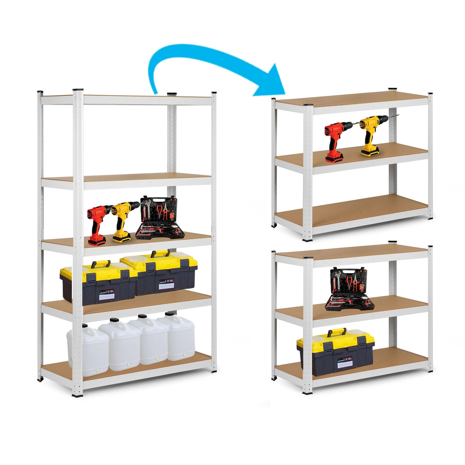 Universele metalen stelling HUMBREG in wit met 5 stevige MDF legplanken, draagvermogen tot 625 kg en schroefloze klikmontage. Dankzij de verstelbare plankhoogte, beschermdoppen voor de poten en afgeronde randen is hij ideaal voor garage, kelder, archief en werkplaats. Kan ook worden opgesplitst in twee kleinere stellingen of worden gebruikt als werkbank.