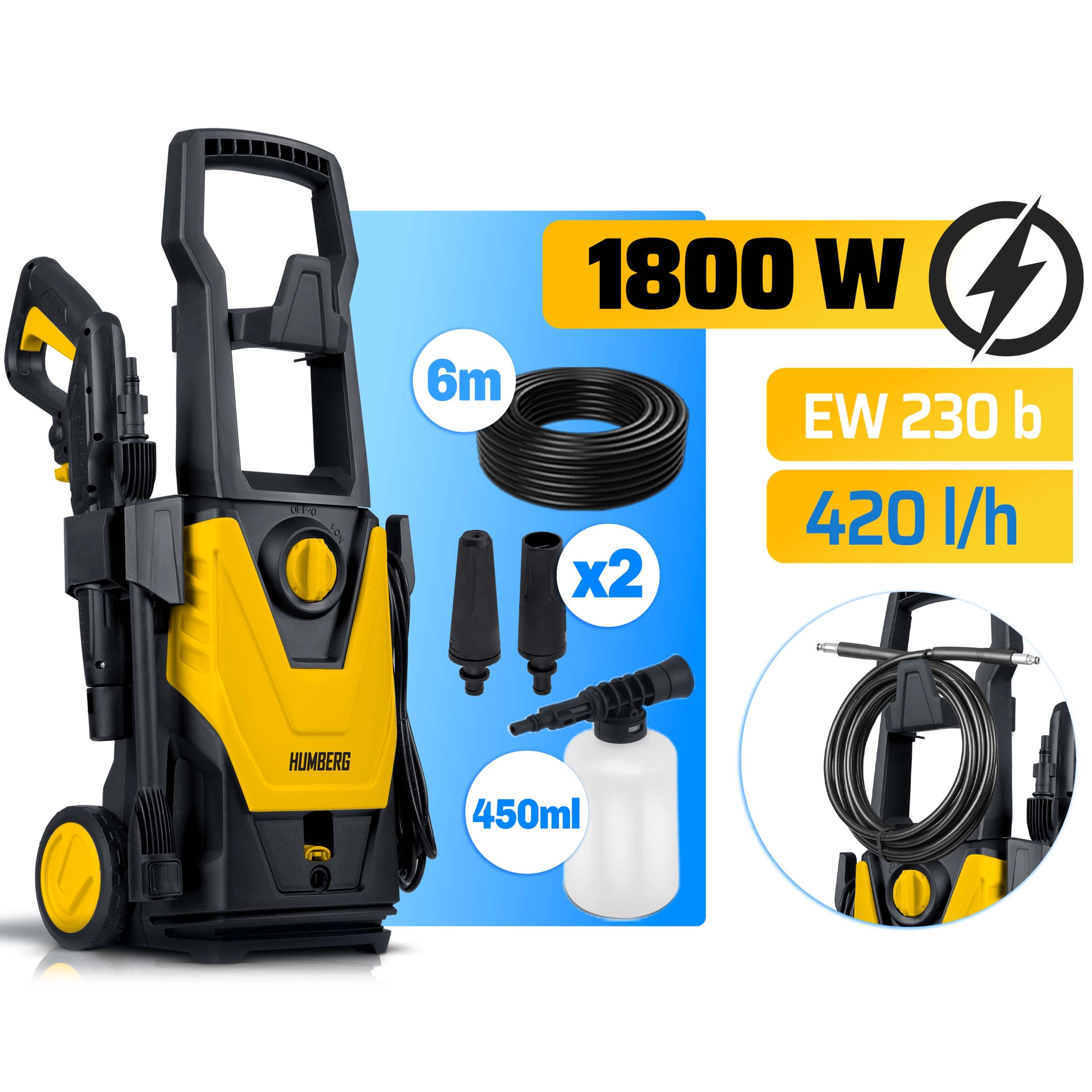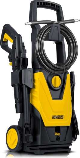 Compacte en krachtige HUMBERG HM-300 hogedrukreiniger met een 1800 W motor, zelfaanzuigende aluminium pomp en een druk tot 135 bar – ideaal voor het reinigen van auto, bestrating en terras. Wordt geleverd met een regelbaar mondstuk, TurboStream™ turbomondstuk, schuimlans (450 ml), 6 m hogedrukslang en 5 m netsnoer. Het StopAndSafe™-systeem bespaart water en energie en verlengt de levensduur van het apparaat; de mogelijkheid om heet water tot 60 °C toe te voeren verhoogt de reinigingsefficiëntie.
