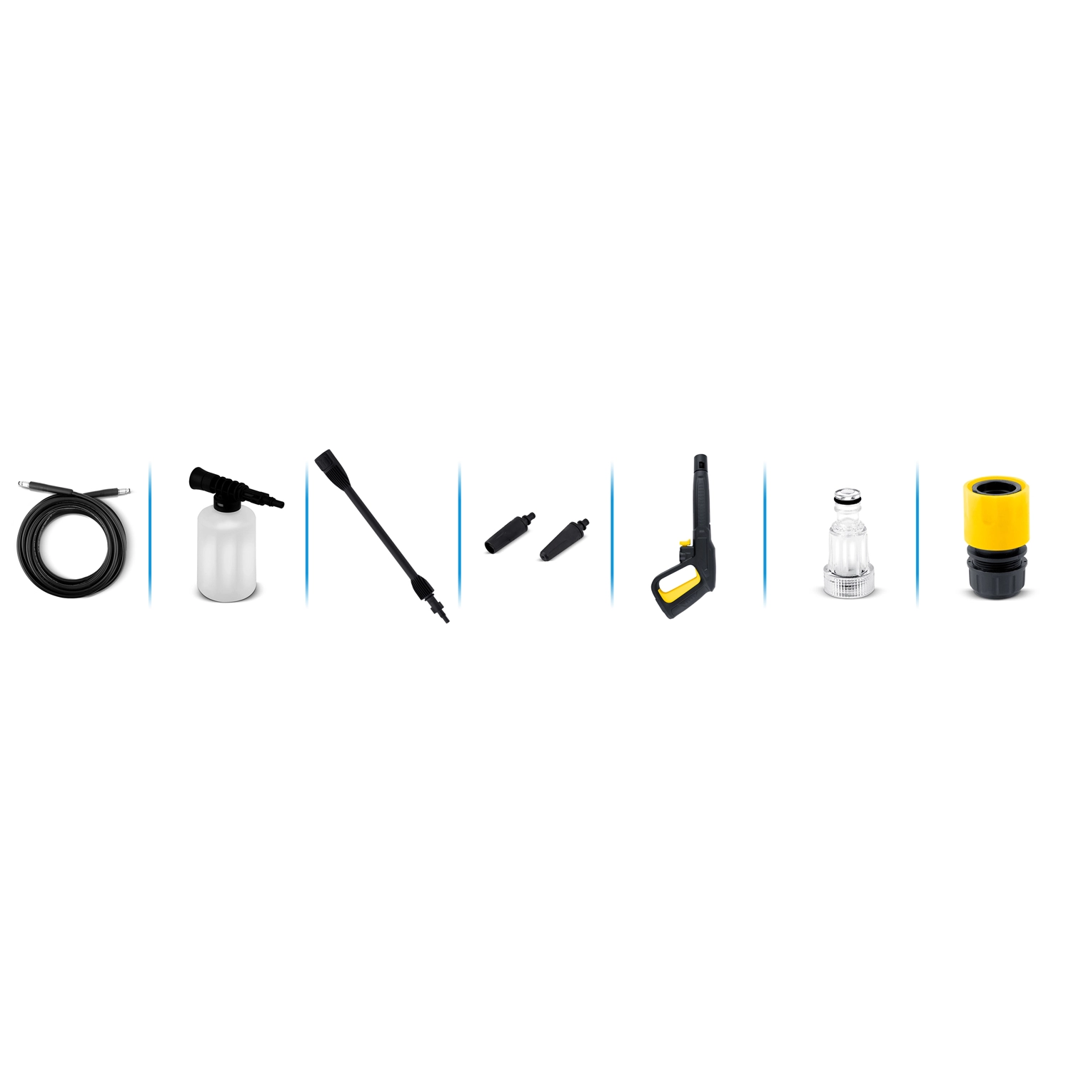 - lans met verstelbaar mondstuk, turbomondstuk, 6 m hogedrukslang, watertoevoeraansluiting, snelkoppeling, fles voor reinigingsmiddel 450 ml, reinigingsnaald voor mondstukken, 5 m netsnoer
