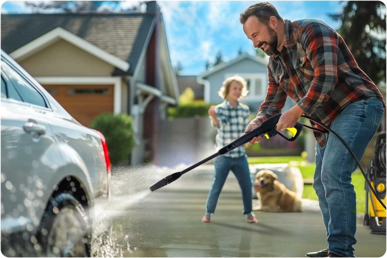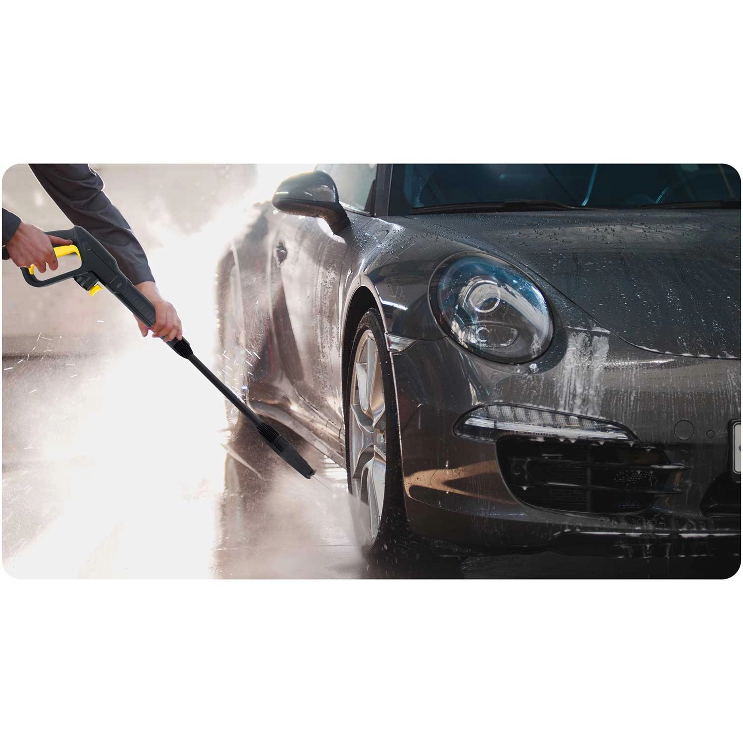 Voor veiliger en zuiniger werken is er StopAndSafe22 2D automatische drukontlasting en trekkerblokkering besparen water en energie en beschermen de pomp tegen oververhitting. De aan te sluiten 450 ml schuimfles met doseerregeling maakt het wassen van auto27s en motorfietsen eenvoudiger. Er is ook een waterfilter inbegrepen dat voorkomt dat vuil in de pomp en sproeiers terechtkomt.