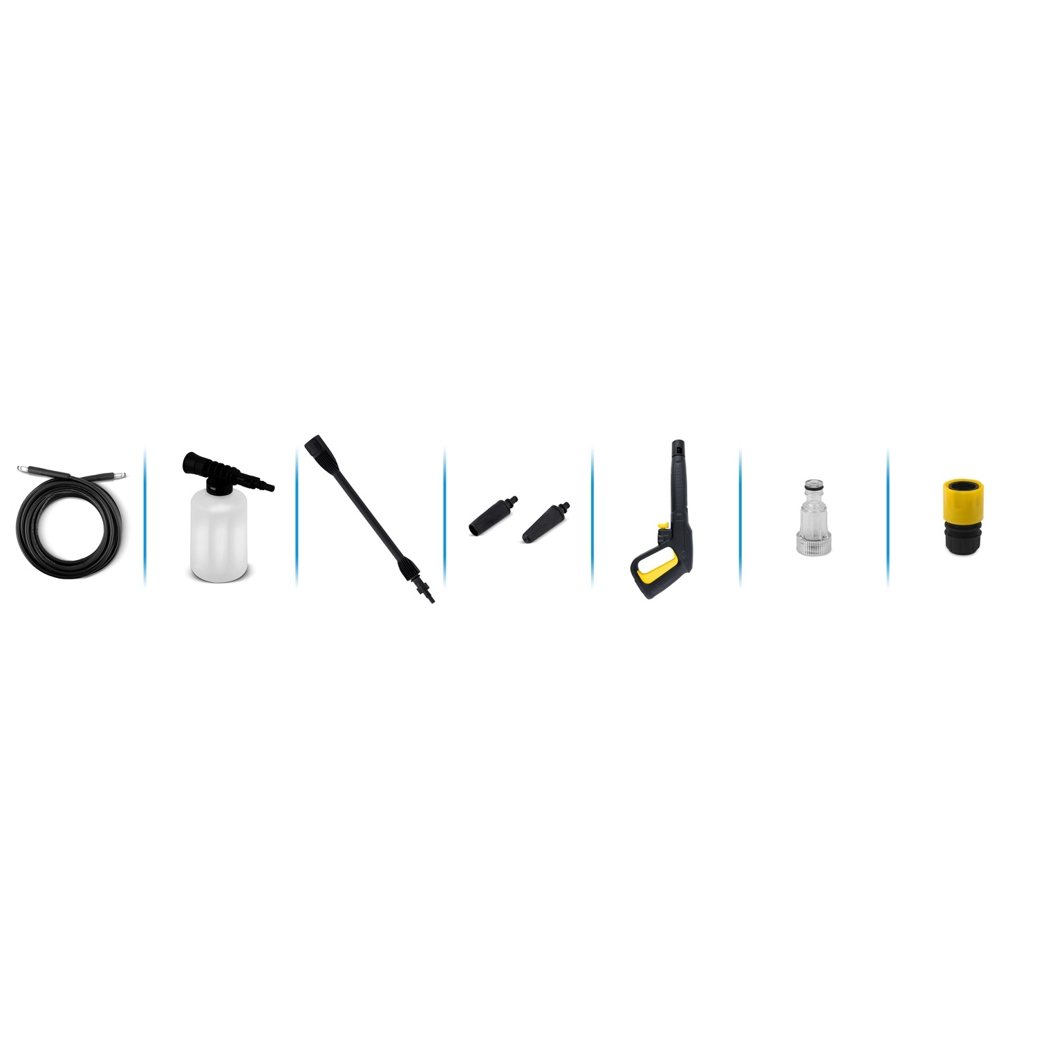 - verstelbare spuitmond, TurboStream22 turbomond, 6 m hogedrukslang, snelkoppeling en wateraansluiting, 450 ml reinigingsmiddelfles met regeling, reinigingsnaald, voedingskabel 5 m, geïntegreerd waterfilter