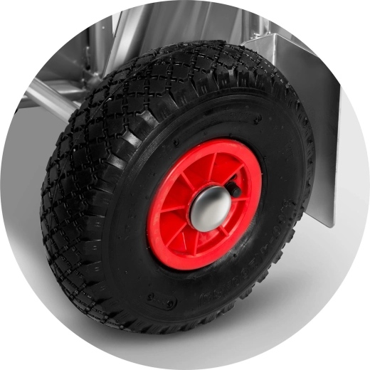 Grote luchtbanden met ventielen en metalen versteviging zorgen voor soepel transport over drempels, tegels en ruwere ondergronden.