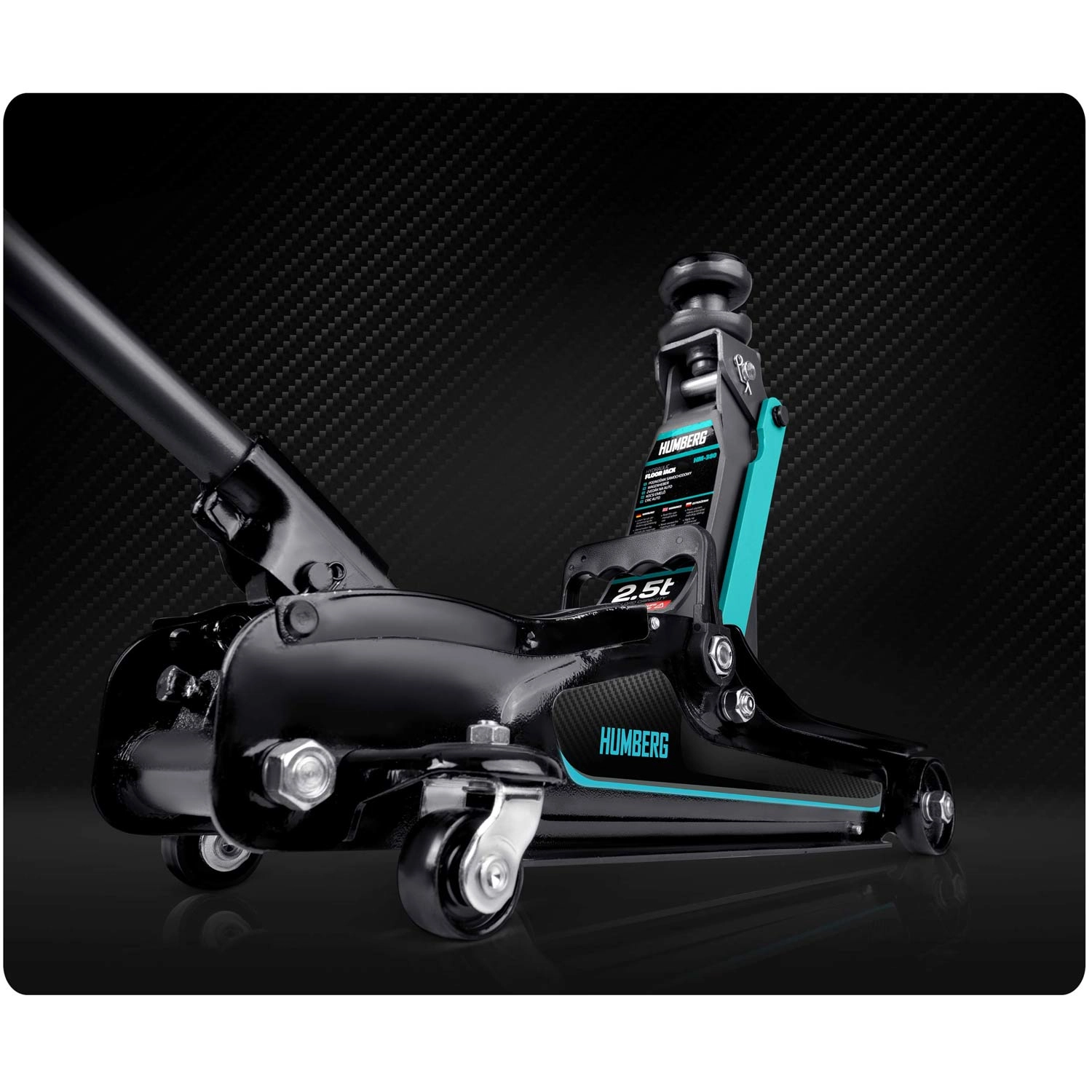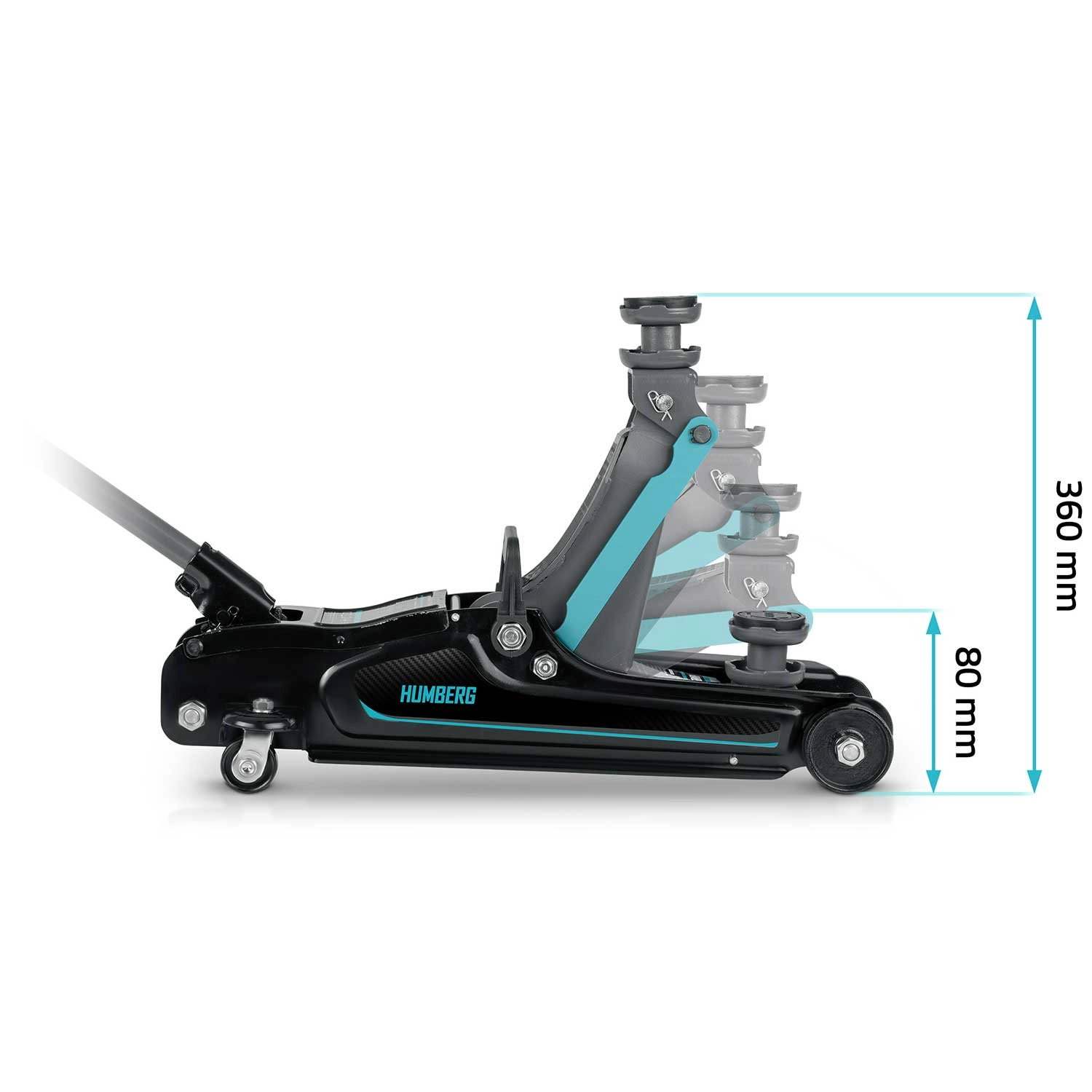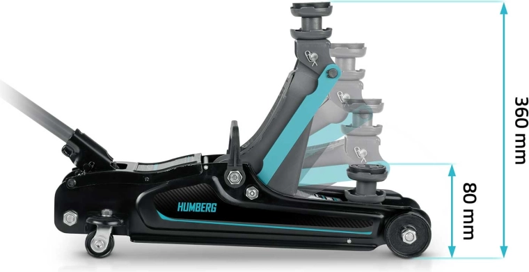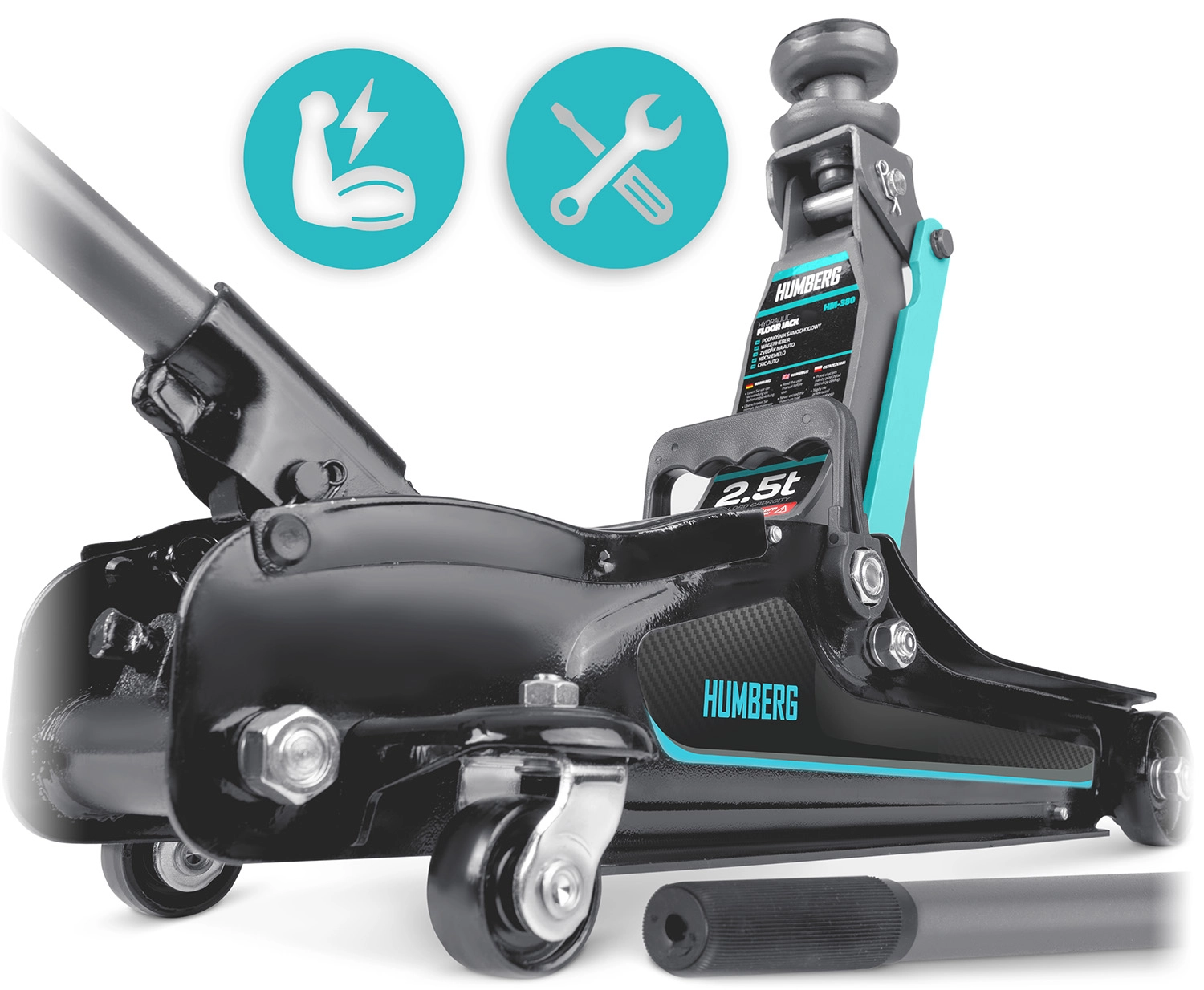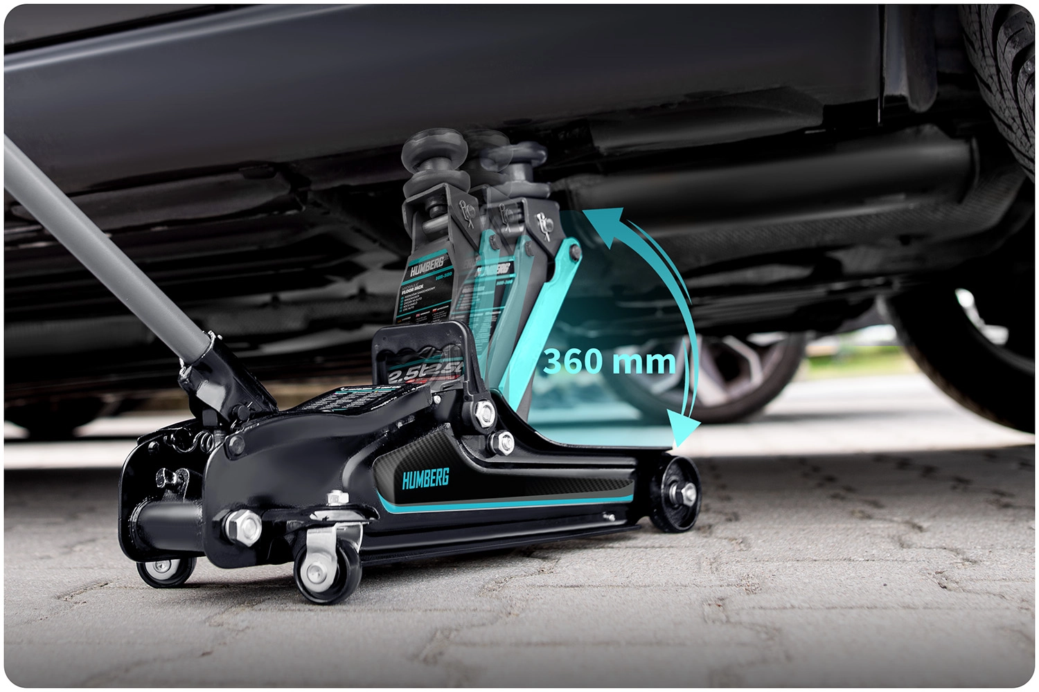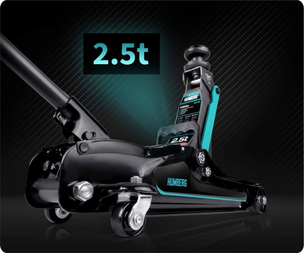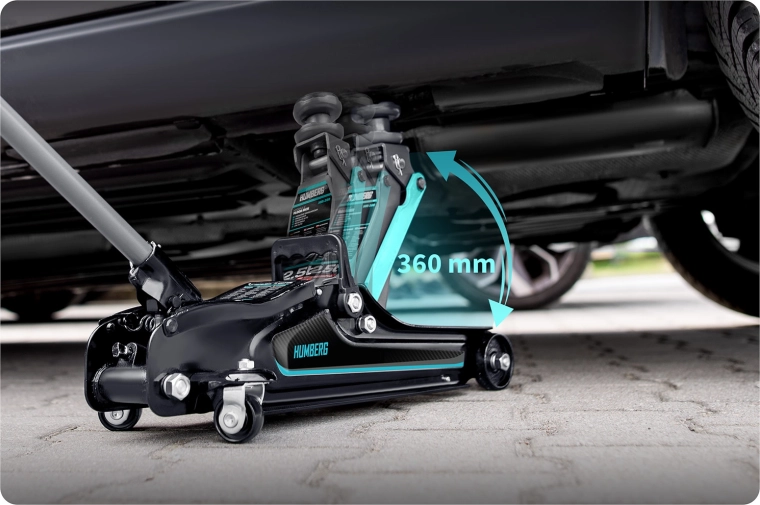 Krachtige laagprofiel hydraulische krik HUMBERG met een draagvermogen van 2,5 t en een hefbereik van 80–360 mm, ideaal voor personenauto’s en kleine bestelwagens. Biedt een robuuste staal-aluminium constructie, makkelijk manoeuvreren dankzij 360° wielen en een veiligheids-overstortklep. In de verpakking zitten 2 verwisselbare rubberen pads en een verhoogde stalen kop voor een betere aanpassing aan verschillende dorpels van voertuigen.