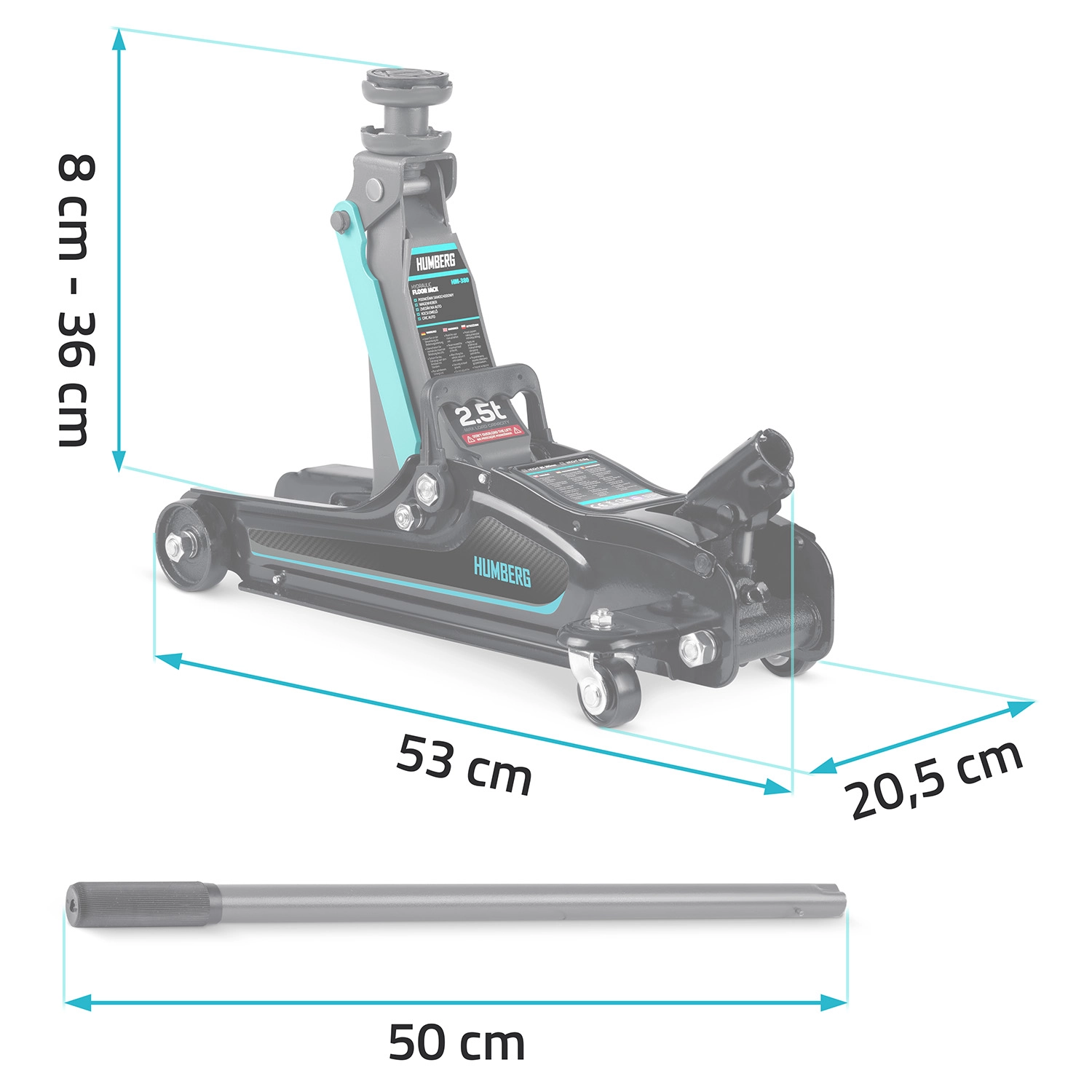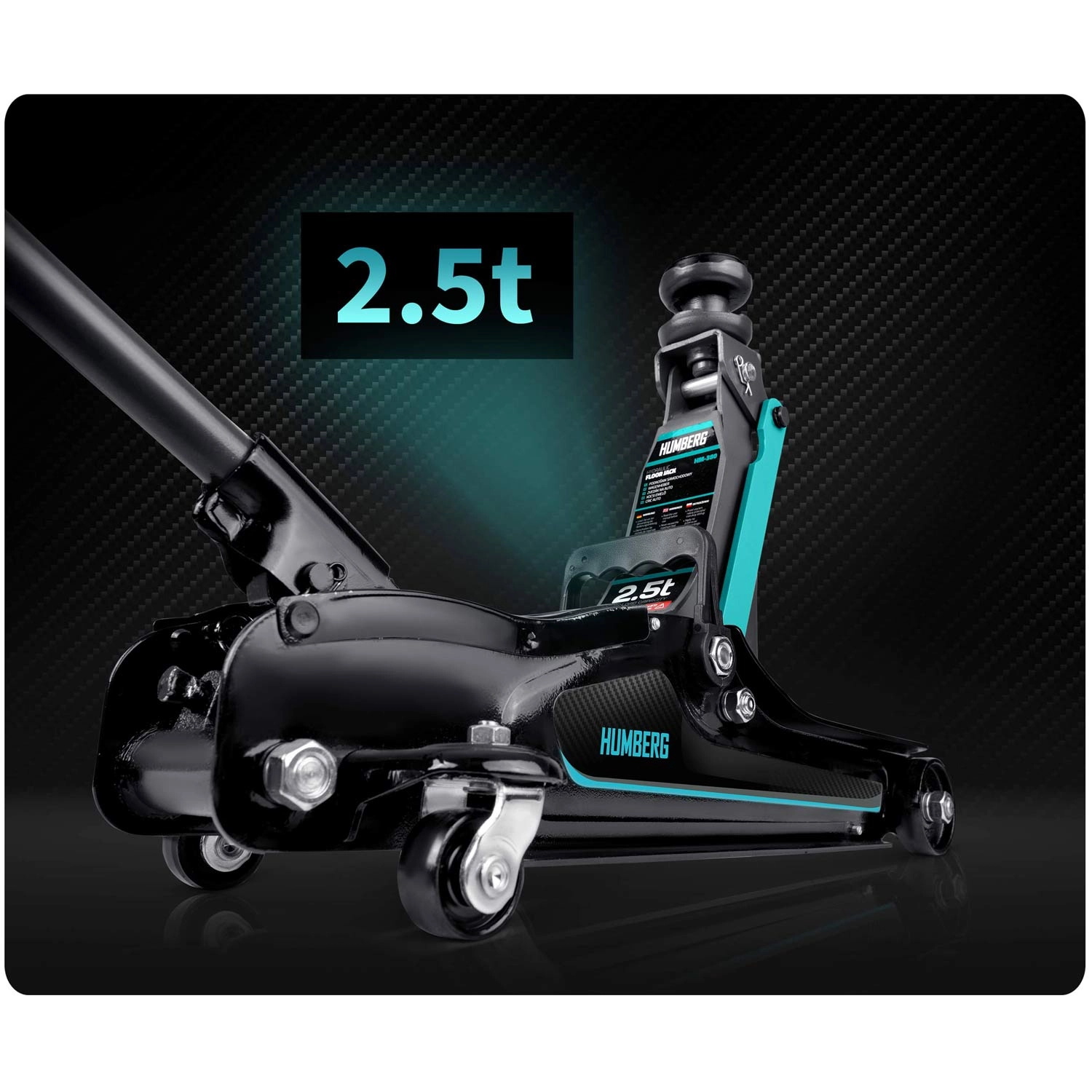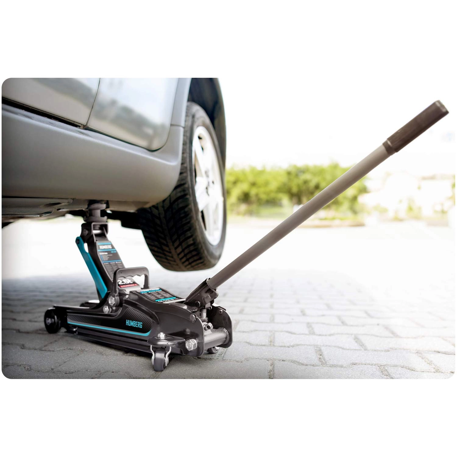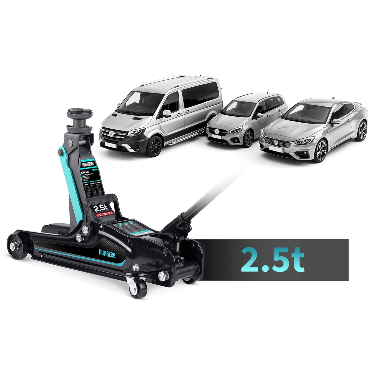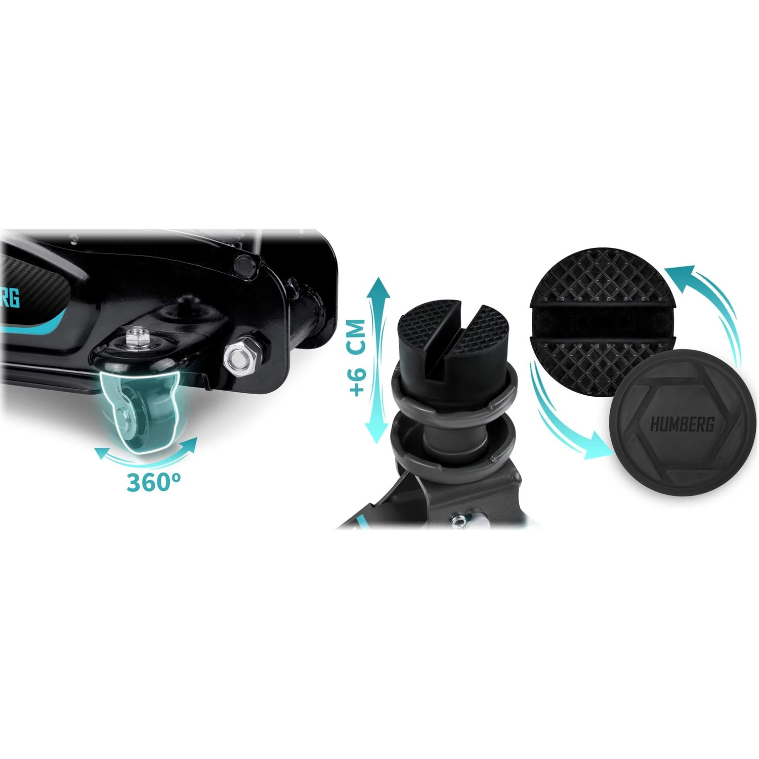 Krachtige laagprofiel hydraulische krik HUMBERG met een draagvermogen van 2,5 t en een hefbereik van 80–360 mm, ideaal voor personenauto’s en kleine bestelwagens. Biedt een robuuste staal-aluminium constructie, makkelijk manoeuvreren dankzij 360° wielen en een veiligheids-overstortklep. In de verpakking zitten 2 verwisselbare rubberen pads en een verhoogde stalen kop voor een betere aanpassing aan verschillende dorpels van voertuigen.