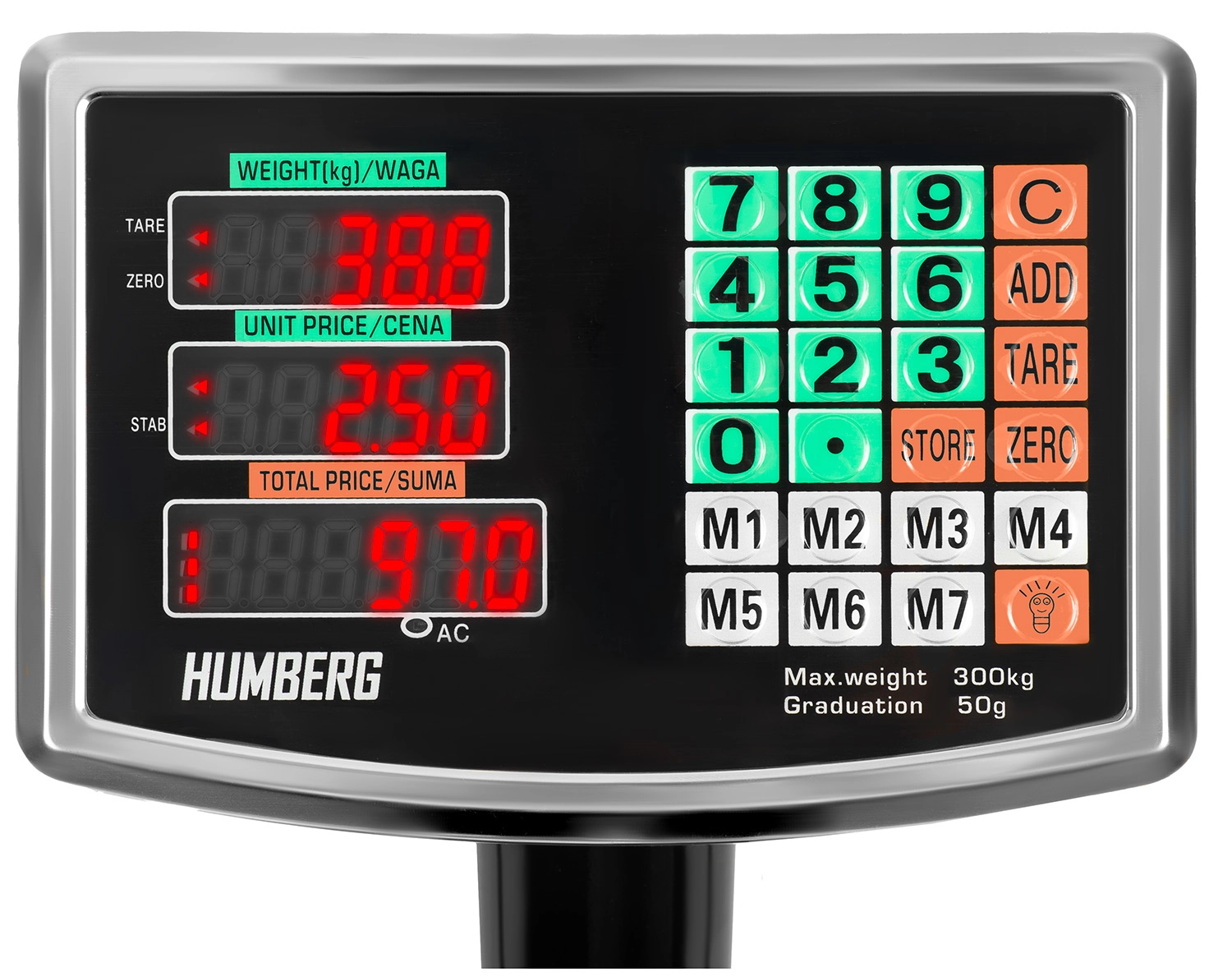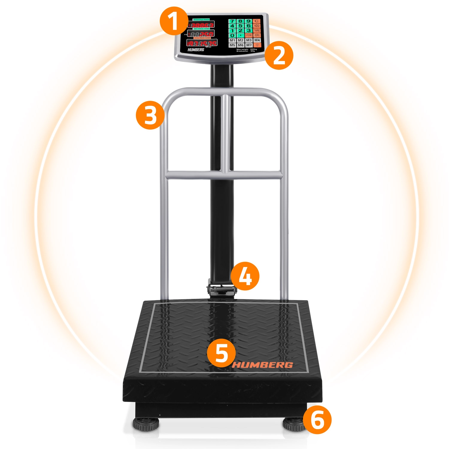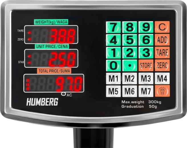 Het drievoudige verlichte display is uitstekend leesbaar; het functionele toetsenbord omvat onder meer geheugen voor tot 7 prijzen en een stuktelmodus (1–99). Dankzij de overbelastingswaarschuwing, automatisch in-/uitschakelen en verstelbare pootjes is de bediening snel en veilig. De voeding gebeurt via een netadapter of een 6 V 4Ah-accu voor mobiel gebruik zonder stopcontact.