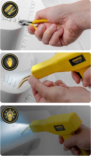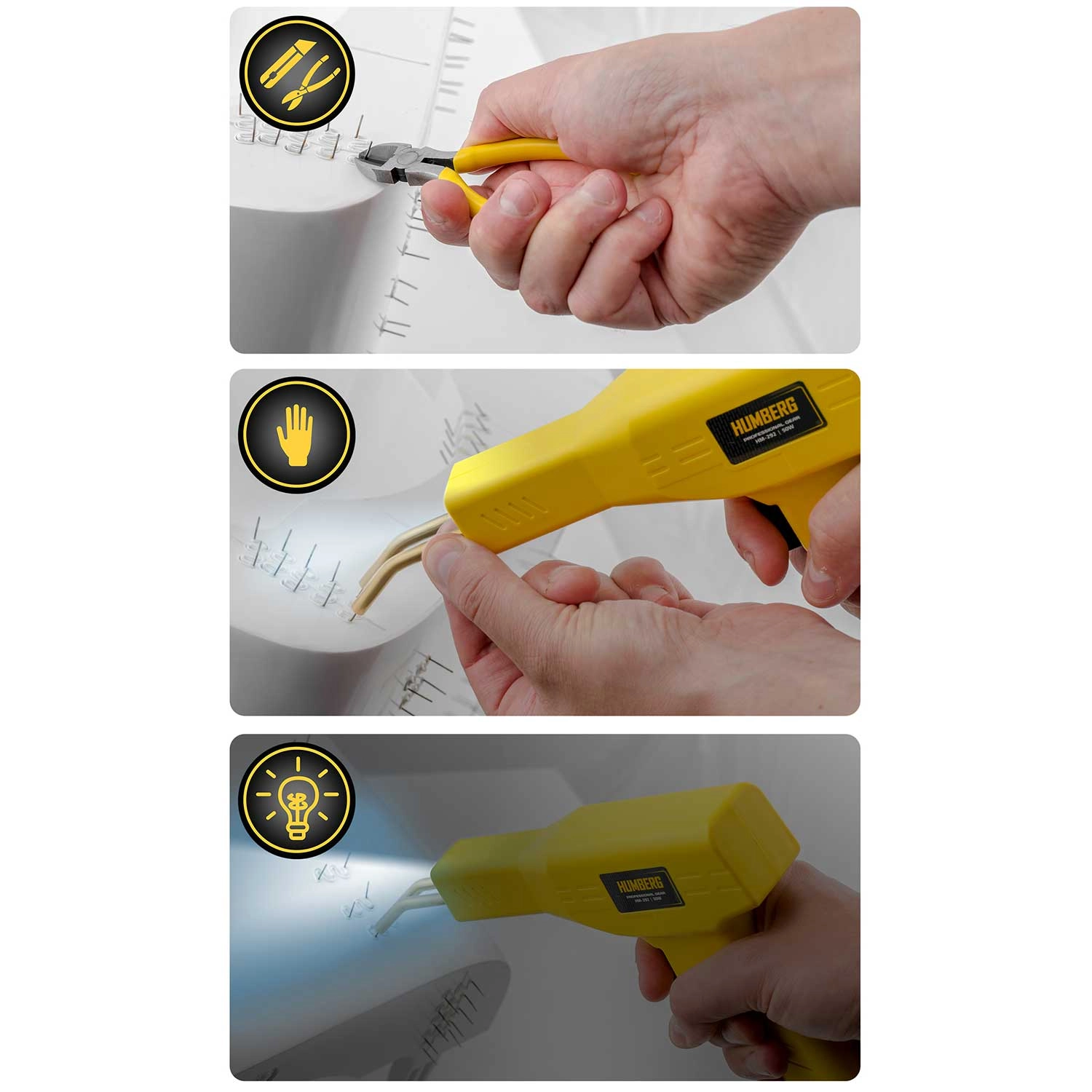 Vier typen nietjes (4×50 st.) voor verschillende scheuren, een tang om uiteinden te verwijderen en een afbreekmes voor de finale uitlijning.
