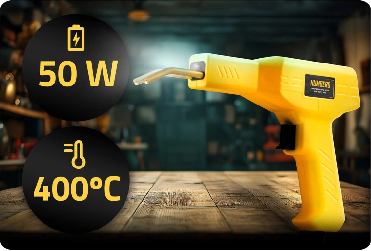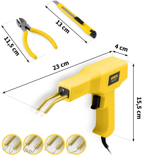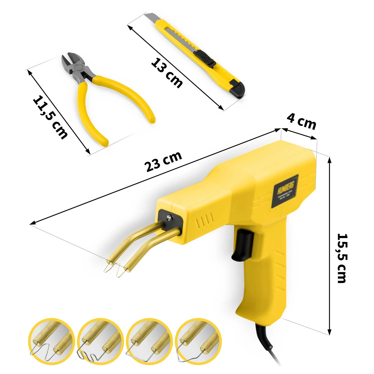 Praktische HUMBERG kunststoflasser met een vermogen van 50 W en opwarmen in 5 s tot 400 °C, ideaal voor snelle reparaties van bumpers, behuizingen van apparaten en voertuiginterieurs. De complete set in koffer bevat 200 nietjes in 4 types, LED-verlichting, tang voor uitsteken en een afbreekmes voor een nette afwerking. De robuuste PP-behuizing raakt niet oververhit en zorgt voor eenvoudige en veilige bediening.