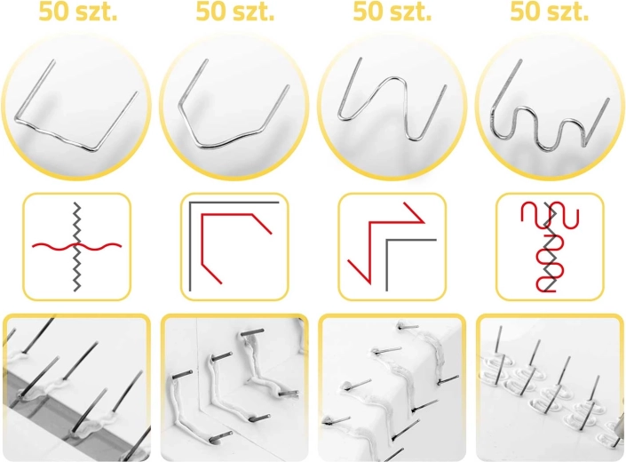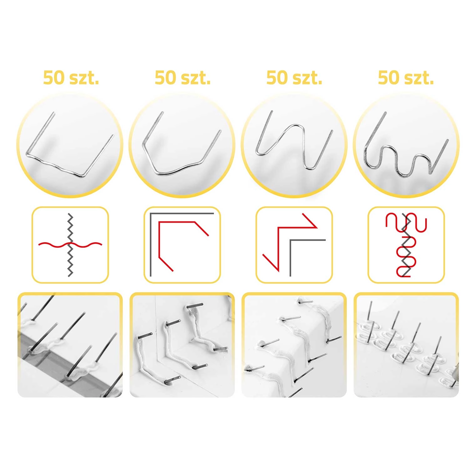 De set bevat een uitgebreide selectie van 200 nietjes in 4 vormen voor diverse soorten scheuren – recht, binnen- en buitenhoeken en bredere beschadigingen. Na het lassen verwijder je eenvoudig de uitstekende uiteinden met de tang en egaliseer je het oppervlak met het afbreekmes voor een schoon resultaat, klaar voor eventueel schuren of lakken.