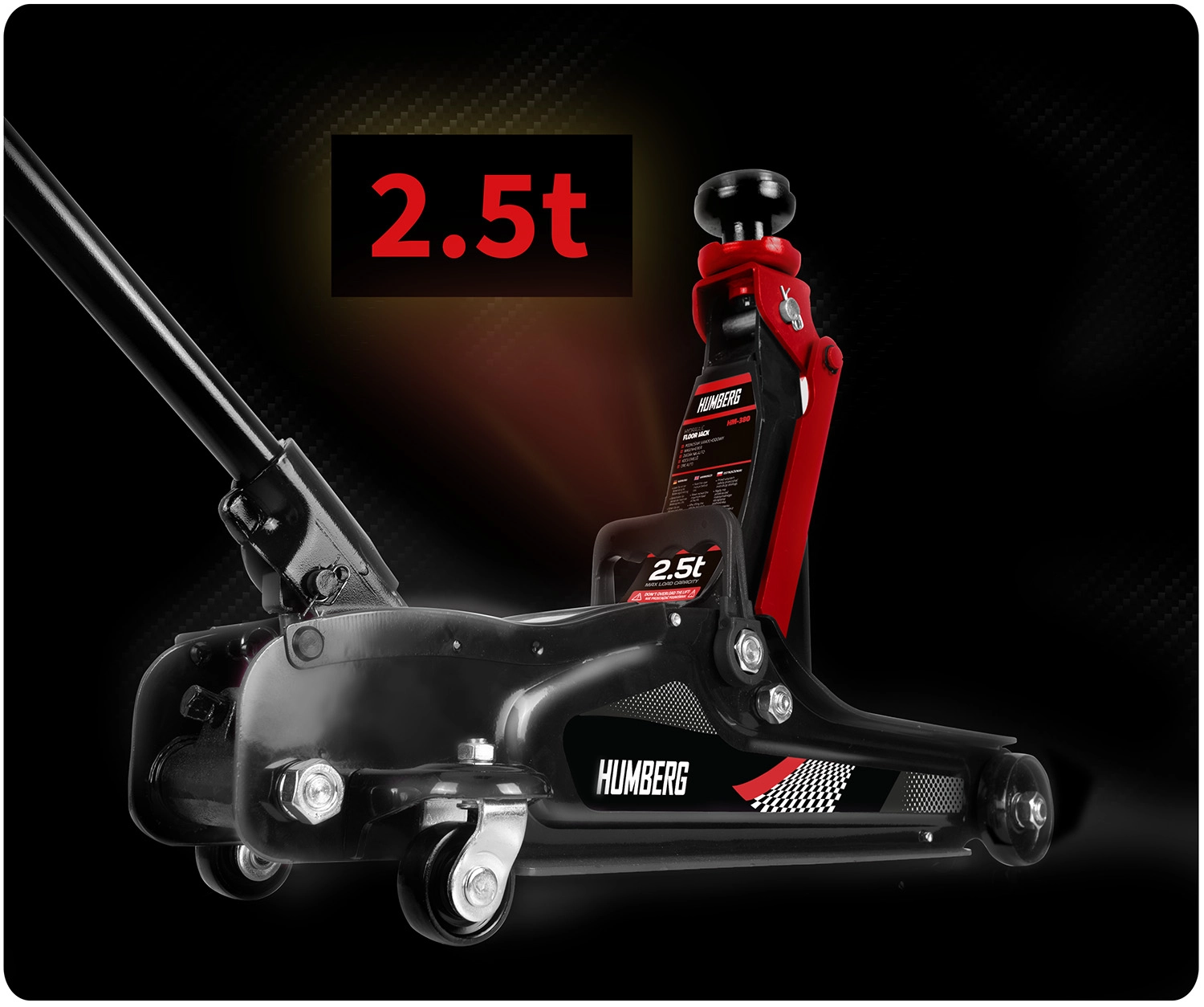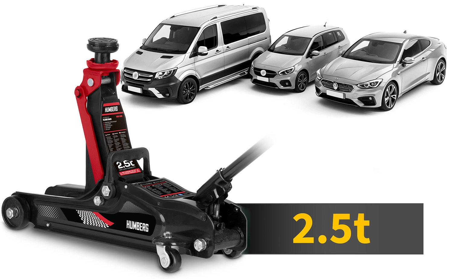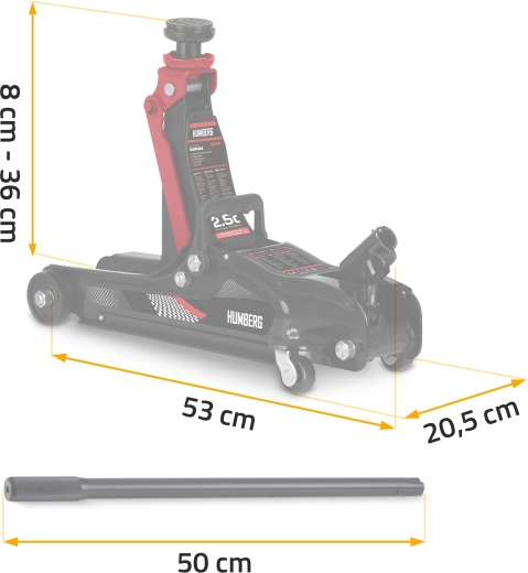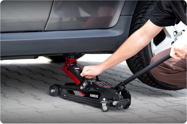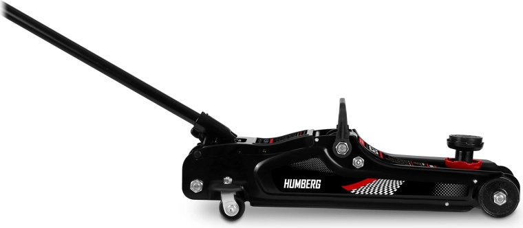 De krachtige laagprofiel hydraulische krik van HUMBERG met een draagvermogen van 2,5 t heft personenauto’s en kleine bestelwagens betrouwbaar op. Dankzij het hefbereik van 80–360 mm past hij ook onder lage auto's, heeft een stalen‑aluminium constructie, 360° draaibare wieltjes voor eenvoudig manoeuvreren en wordt geleverd met verwisselbare rubberen opzetstukken en een extra stalen kop voor een betere aanpassing aan diverse dorpelhoogtes.