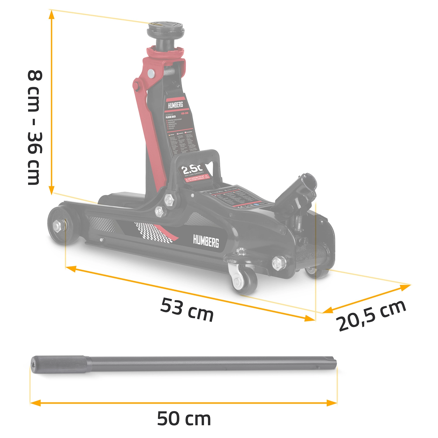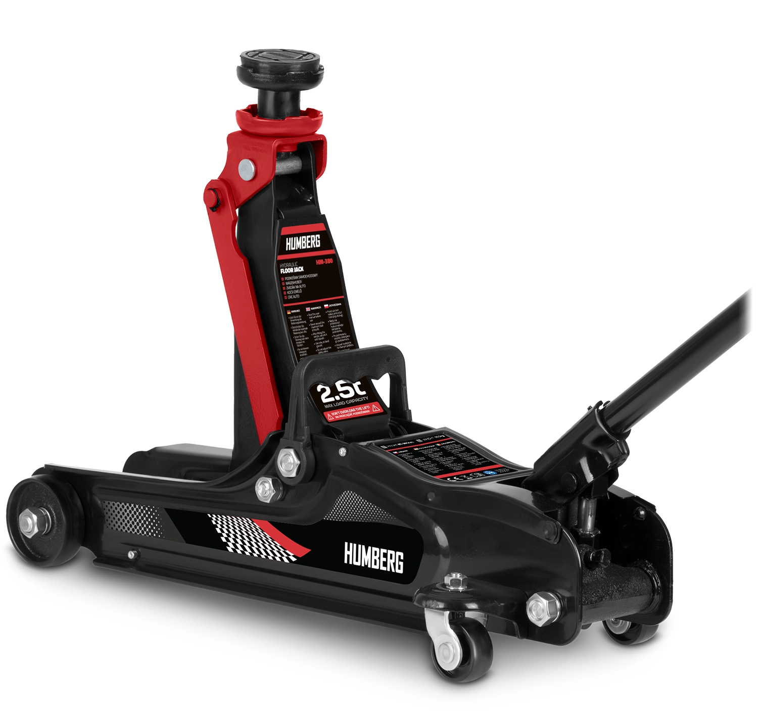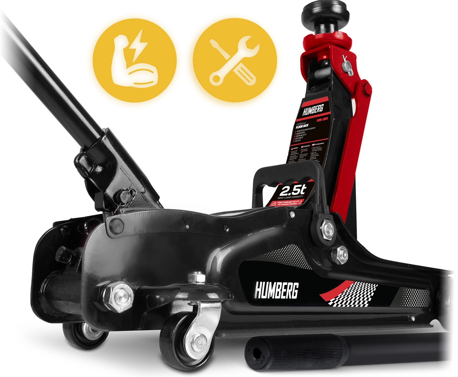 De krachtige laagprofiel hydraulische krik van HUMBERG met een draagvermogen van 2,5 t heft personenauto’s en kleine bestelwagens betrouwbaar op. Dankzij het hefbereik van 80–360 mm past hij ook onder lage auto's, heeft een stalen‑aluminium constructie, 360° draaibare wieltjes voor eenvoudig manoeuvreren en wordt geleverd met verwisselbare rubberen opzetstukken en een extra stalen kop voor een betere aanpassing aan diverse dorpelhoogtes.