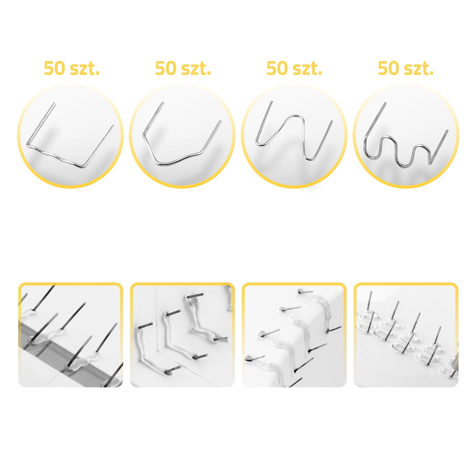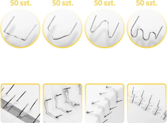 In de set zitten 4 typen nietjes (4×50 st.) voor verschillende scheuren en bovendien 600 universele gegolfde nietjes van 0,8 mm.