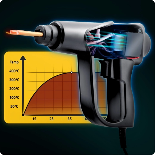 Directe start bespaart tijd bij elke reparatie. Een stabiele temperatuur zorgt voor sterke en schone verbindingen in de meeste kunststoffen.