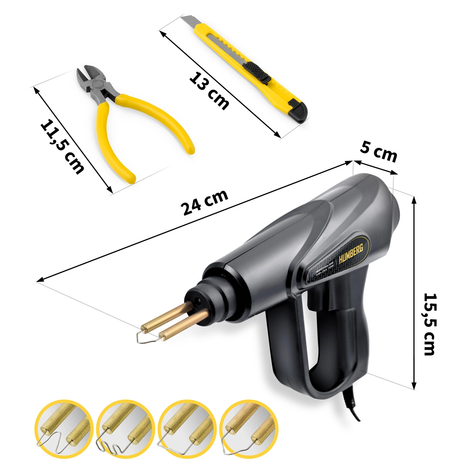 Praktische HUMBERG 70 W kunststoflasser in een robuuste koffer is de kant-en-klare oplossing voor snelle reparaties van bumpers, kappen en kunststof onderdelen. Opgewarmd in 3 seconden tot 400 °C, 4 soorten nietjes (200 st.) + nog eens 600 gegolfde nietjes van 0,8 mm, geïntegreerde LED-verlichting en een ergonomisch ontwerp maken het werk thuis en in de werkplaats eenvoudiger.