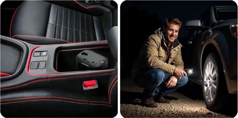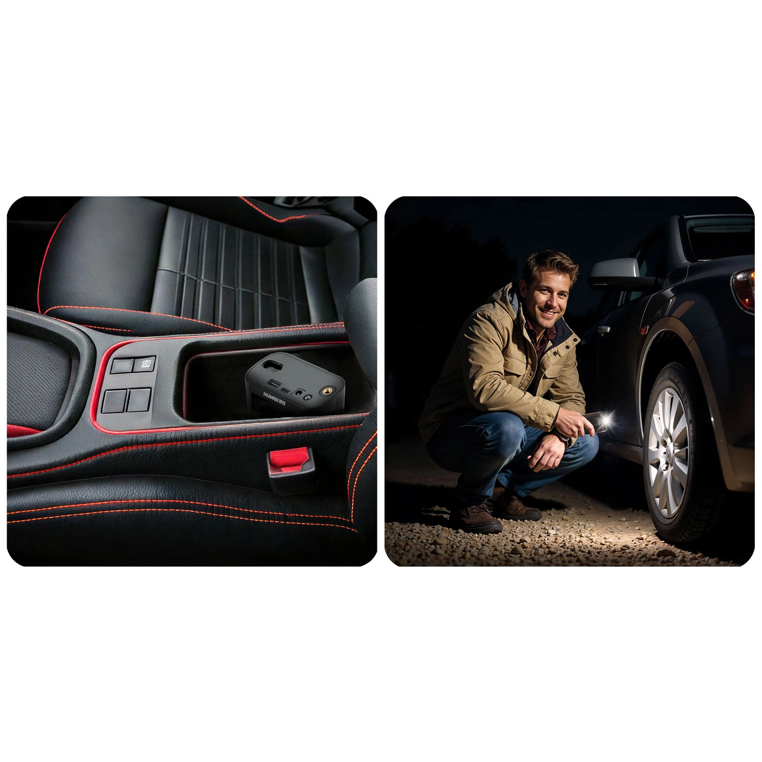 Geïntegreerd LED-licht met SOS-signaal en powerbank-functie bieden zekerheid bij nachtelijke reparaties en stroomuitval.