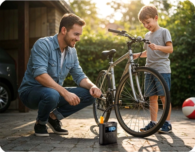 Vier vooringestelde modi + eigen instelling dekken de meeste behoeften. Ideaal voor banden en sportuitrusting – thuis, in de garage en onderweg.