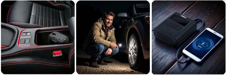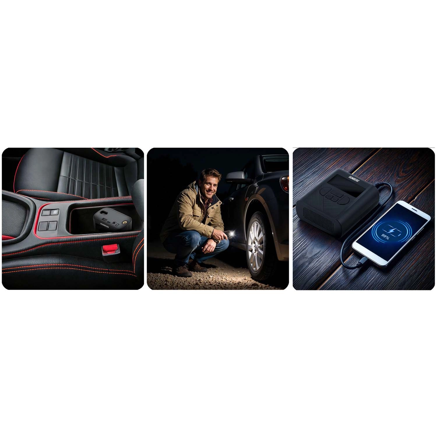 Je gebruikt hem voor autobanden, motor- en fietsbanden, maar ook voor sportballen of opblaasspeelgoed. De ingebouwde LED-zaklamp met SOS-signaal vergroot de veiligheid bij nachtelijke interventies bij het voertuig en de powerbank vult energie aan voor je apparaten.
